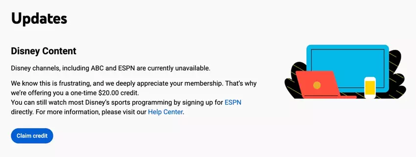 Subskrybenci YouTube TV otrzymają odszkodowanie w wysokości 86 PLN (20 USD) po tym, jak z serwisu zniknęły dziesiątki popularnych kanałów telewizyjnych, w tym ESPN, ABC News i Disney Channel. Powodem jest przeciągający się konflikt między YouTube a korporacją Disney dotyczący warunków nowej umowy licencyjnej.