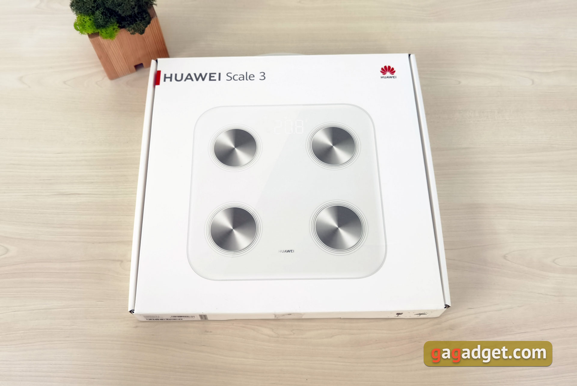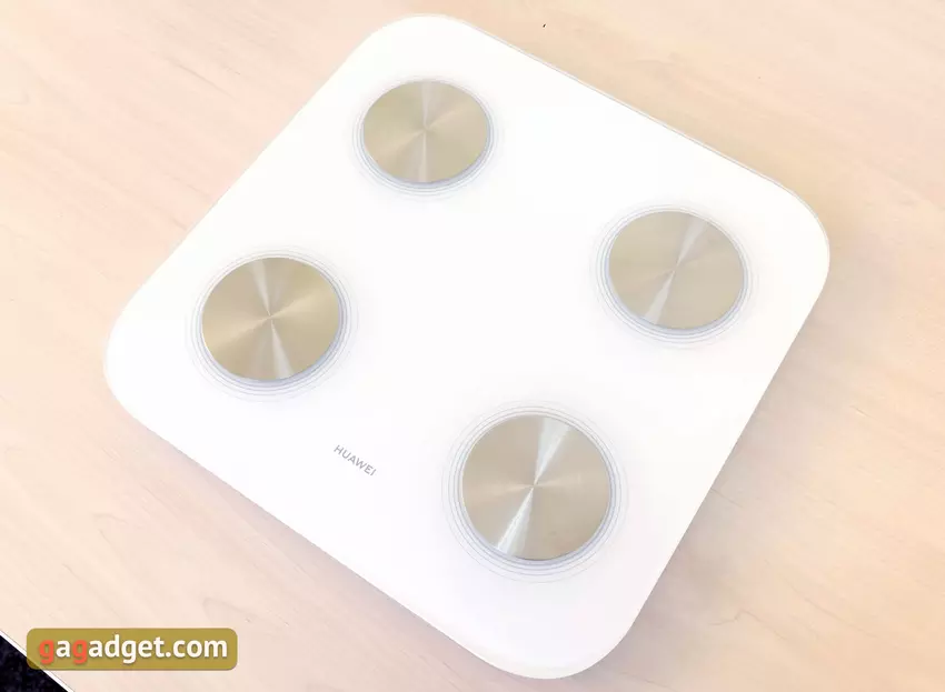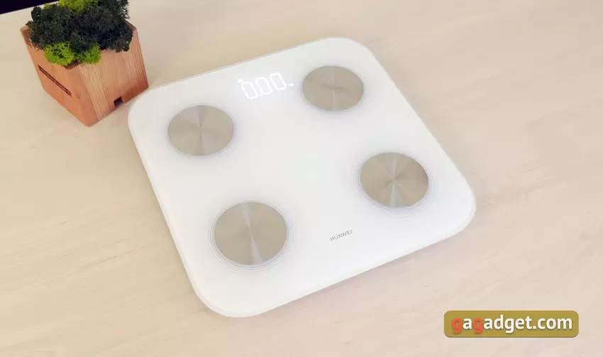 Sądząc po asortymencie w sklepach internetowych, istnieje wiele odmian wyglądu „inteligentnych” wag, zaczynając od designu śmieszne różowe kwiaty po całkowicie neutralne i zgrabne modele. HUAWEI Scale 3 odnoszą się do tych drugich. Kolor biały, góra - szkło, wyświetlacz LED i cztery elektrody do oceny składu ciała na podstawie oporu elektrycznego w tkankach (bioimpedancja).