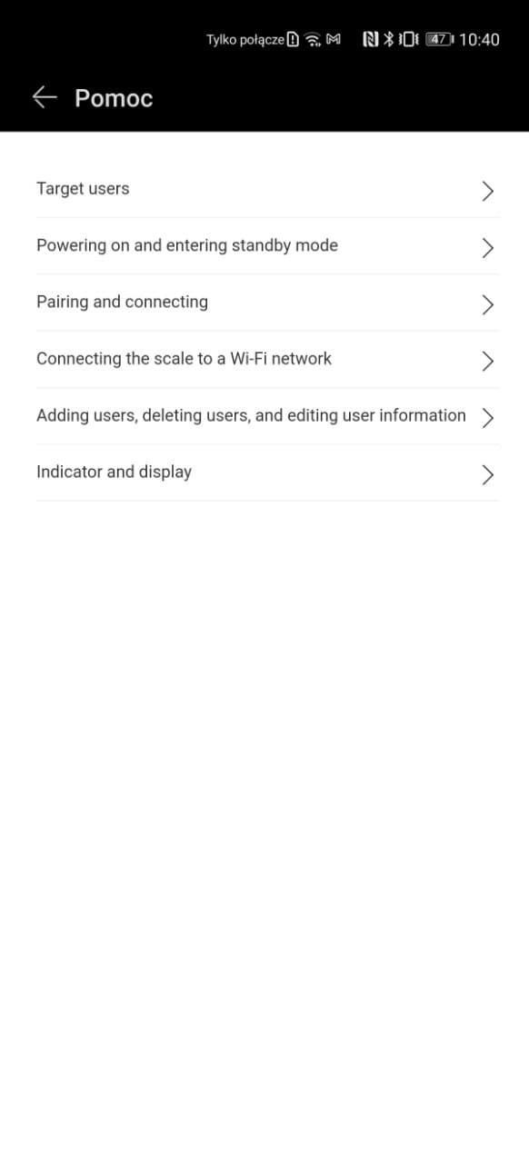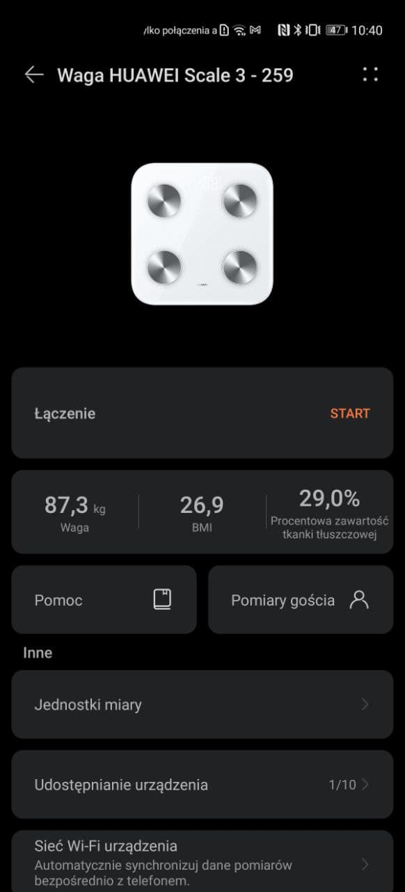 W celu pełnego wykorzystania należy podłączyć HUAWEI Scale 3 do smartfona. Aby to zrobić, musisz zainstalować aplikację Huawei Health. Jest dostępna zarówno w Google Play, jak i AppGallery. W aplikacji należy otworzyć menu dodawania urządzenia i wybrać sekcję „Wagi”. Co dziwne, początkowo na liście nie ma modelu, aplikacja zaczyna automatycznie aktualizować listę obsługiwanych urządzeń. Ale HUAWEI Scale 3 pojawił się na liście dopiero po kilku wymuszonych aktualizacjach listy. Wtedy wszystko jest proste, na ekranie pojawią się instrukcje podłączenia. Po połączeniu ze smartfonem aplikacja zaproponuje dołączyć również i do Wi-Fi. Obsługiwane jest tylko 2,4 GHz. Po co? Połączenie Wi-Fi umożliwia natychmiastowe odbieranie informacji na smartfonie w aplikacji Huawei Health, bez konieczności otwierania aplikacji i wykonywania innych dodatkowych operacji. Obsługiwanych jest do 10 użytkowników, podczas gdy istnieje automatyczne rozpoznawanie. Do tego tryb gościa, którego dane nie zostaną zapisane w Huawei Health.
