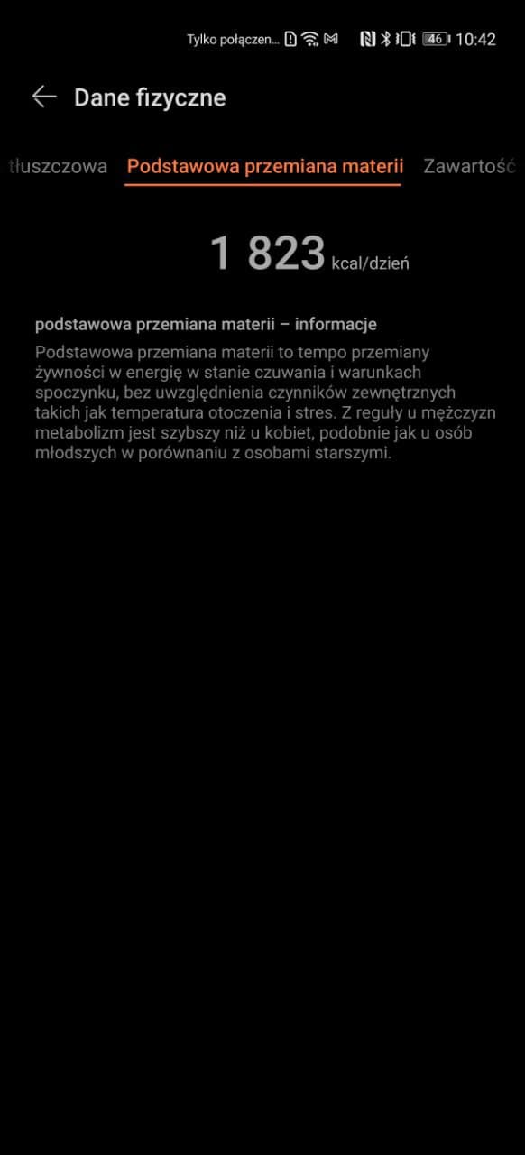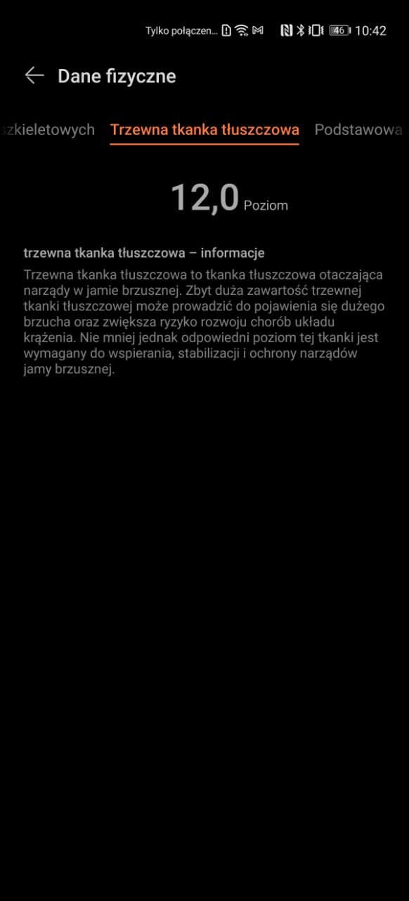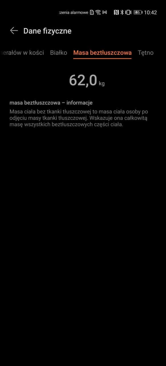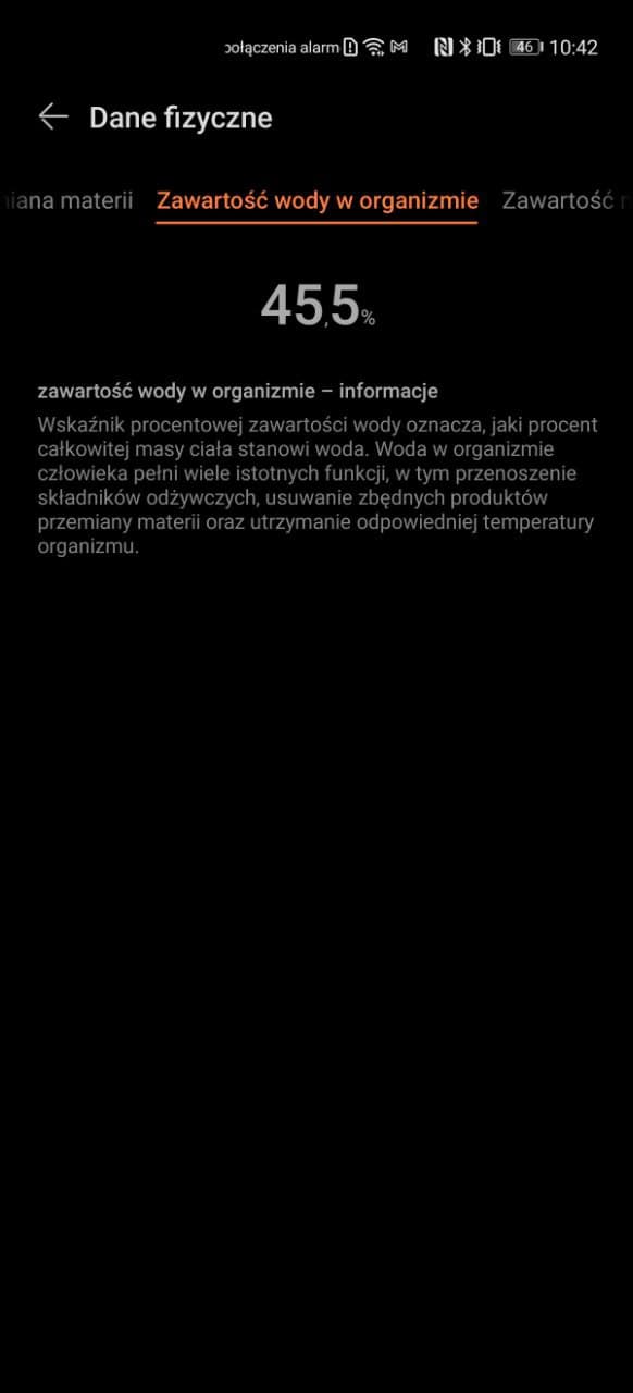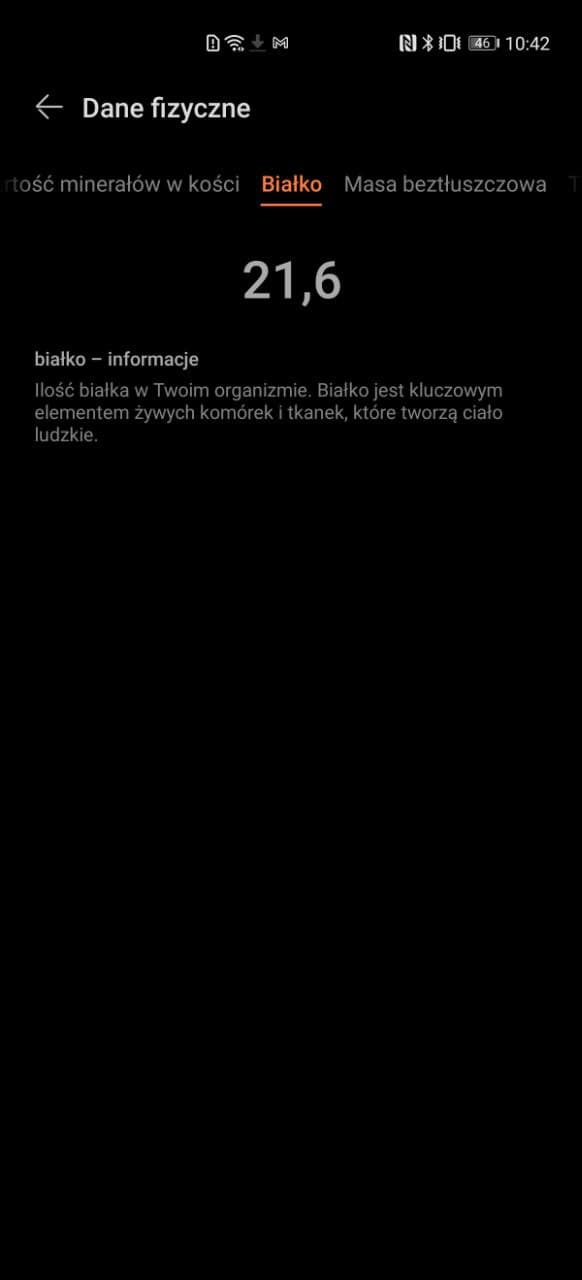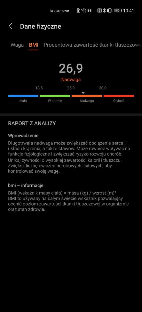 Teraz o tym, co mierzy Huawei Scale 3. Wagi są wyposażone w algorytm Huawei TruFit. Według firmy technologia działa w oparciu o Big Data i został opracowany we współpracy z Instytutem Nauk Fizycznych Hefei oraz Chińską Akademią Nauk. W sumie mierzonych jest 11 wskaźników: waga, puls, wskaźnik rozwoju fizycznego lub wskaźnik masy ciała (BMI), procent tkanki tłuszczowej, wskaźnik utraty tłuszczu (metabolizm), tłuszcz trzewny, masa mięśni szkieletowych, woda w organizmie, mineralizacja kości, białko, itp. beztłuszczowa masa. Wszystko to mierzone jest przy pomocy wspomnianego już pomiaru impedancji bioelektrycznej i autorskich algorytmów. Bezpośrednio w aplikacji znajdują się osobne zakładki z „ściągawkami” o tym, co to jest. Liczba zależy bezpośrednio od procentowej zawartości tkanki tłuszczowej, a podstawowy wskaźnik metaboliczny (przy niezbędnej wiedzy) pomoże obliczyć dzienną dietę i obciążenie. Wagi dostarczają bardzo dużo danych, ale do ich efektywnego wykorzystania potrzebna jest pewna baza wiedzy. Odważę się założyć, że nie każdy użytkownik tak bardzo potrzebuje.