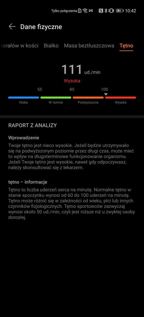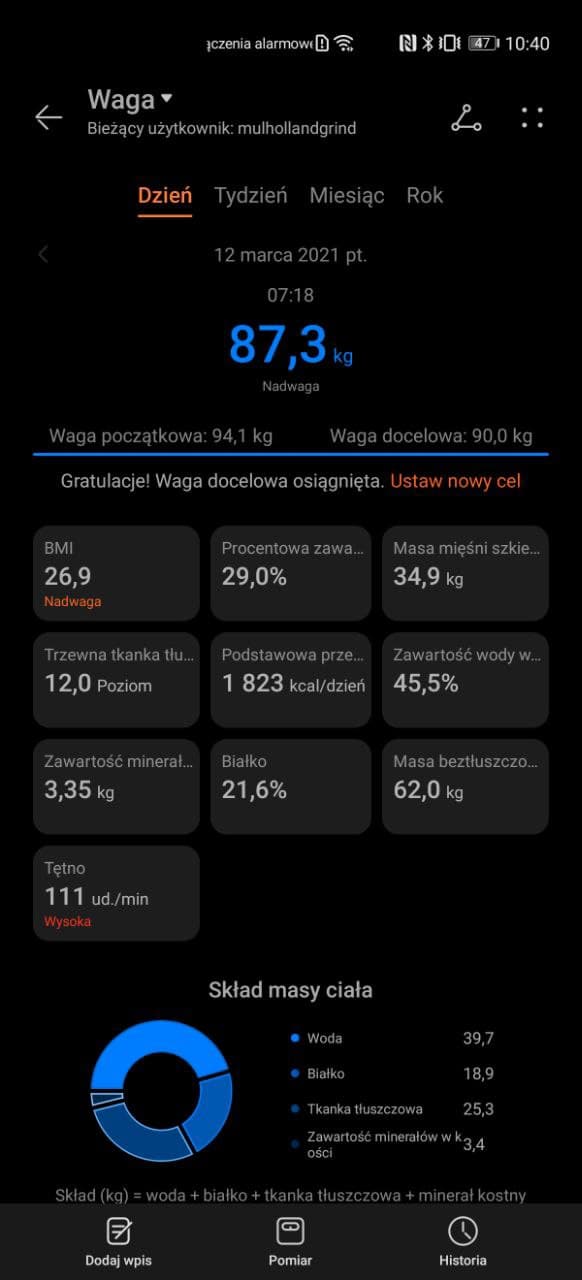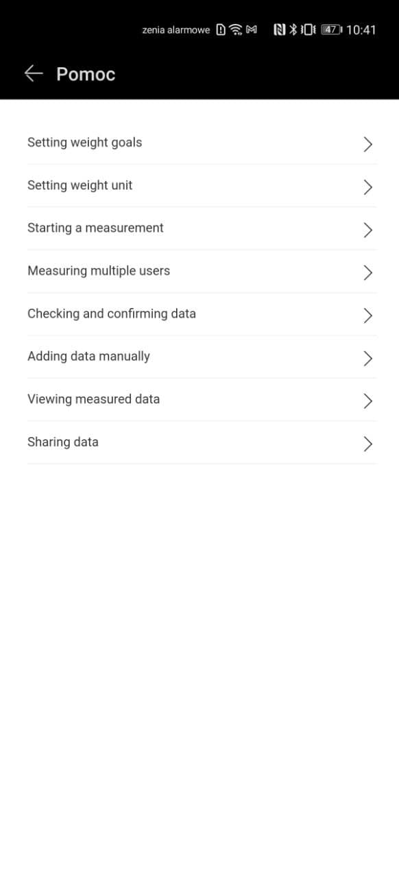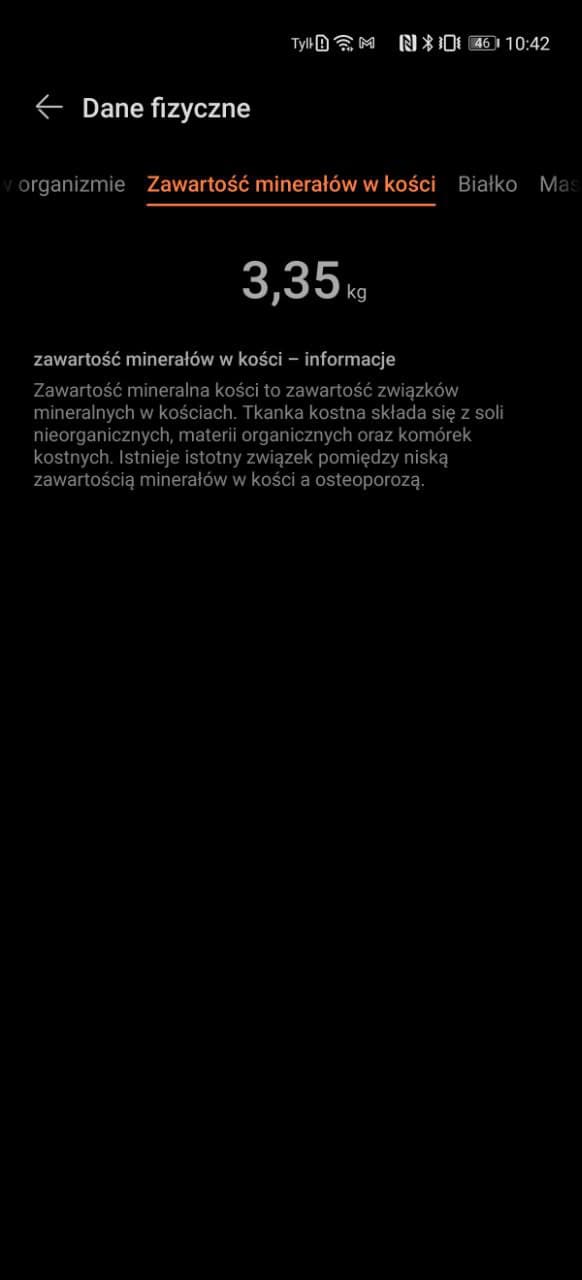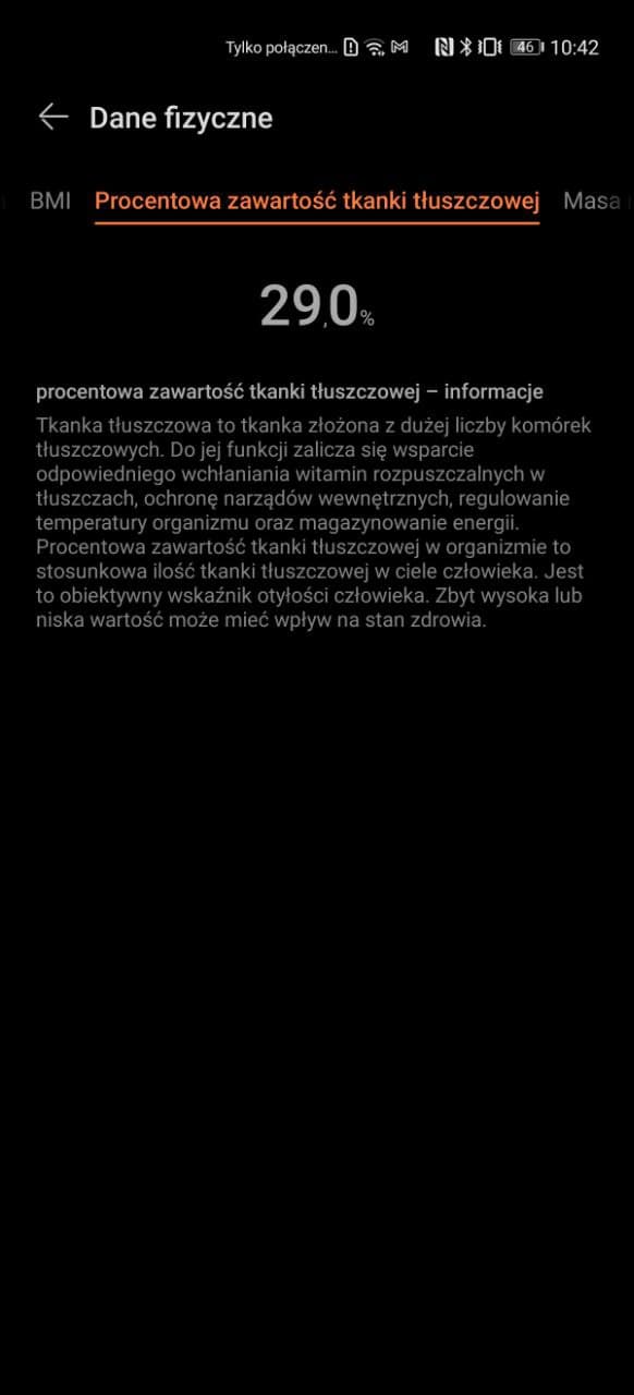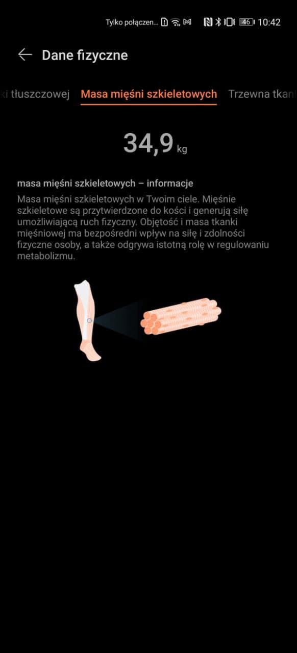 Teraz o tym, co mierzy Huawei Scale 3. Wagi są wyposażone w algorytm Huawei TruFit. Według firmy technologia działa w oparciu o Big Data i został opracowany we współpracy z Instytutem Nauk Fizycznych Hefei oraz Chińską Akademią Nauk. W sumie mierzonych jest 11 wskaźników: waga, puls, wskaźnik rozwoju fizycznego lub wskaźnik masy ciała (BMI), procent tkanki tłuszczowej, wskaźnik utraty tłuszczu (metabolizm), tłuszcz trzewny, masa mięśni szkieletowych, woda w organizmie, mineralizacja kości, białko, itp. beztłuszczowa masa. Wszystko to mierzone jest przy pomocy wspomnianego już pomiaru impedancji bioelektrycznej i autorskich algorytmów. Bezpośrednio w aplikacji znajdują się osobne zakładki z „ściągawkami” o tym, co to jest. Liczba zależy bezpośrednio od procentowej zawartości tkanki tłuszczowej, a podstawowy wskaźnik metaboliczny (przy niezbędnej wiedzy) pomoże obliczyć dzienną dietę i obciążenie. Wagi dostarczają bardzo dużo danych, ale do ich efektywnego wykorzystania potrzebna jest pewna baza wiedzy. Odważę się założyć, że nie każdy użytkownik tak bardzo potrzebuje.