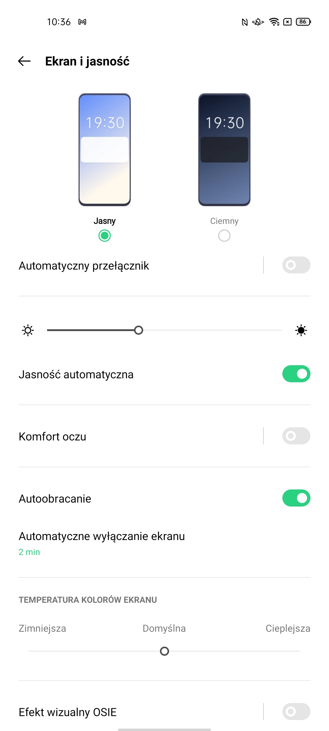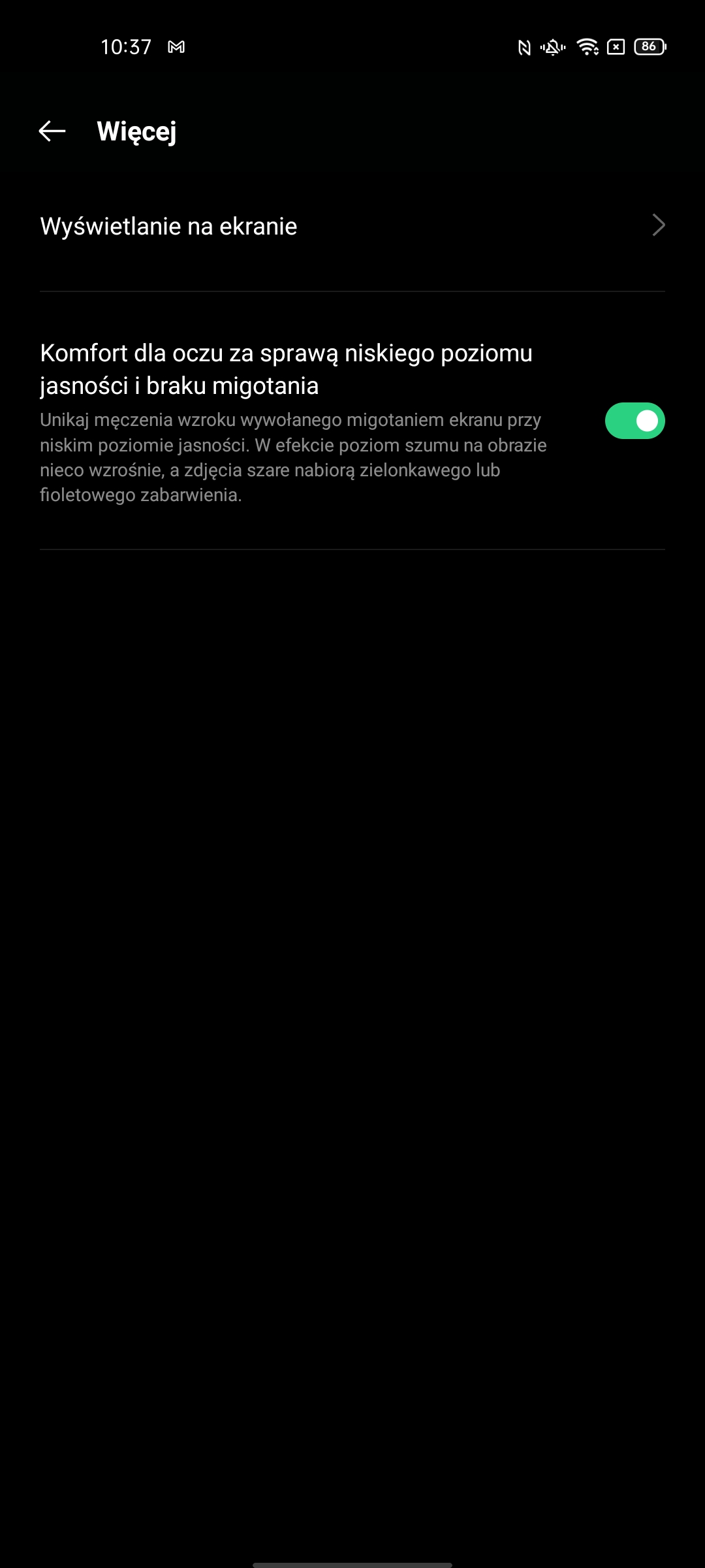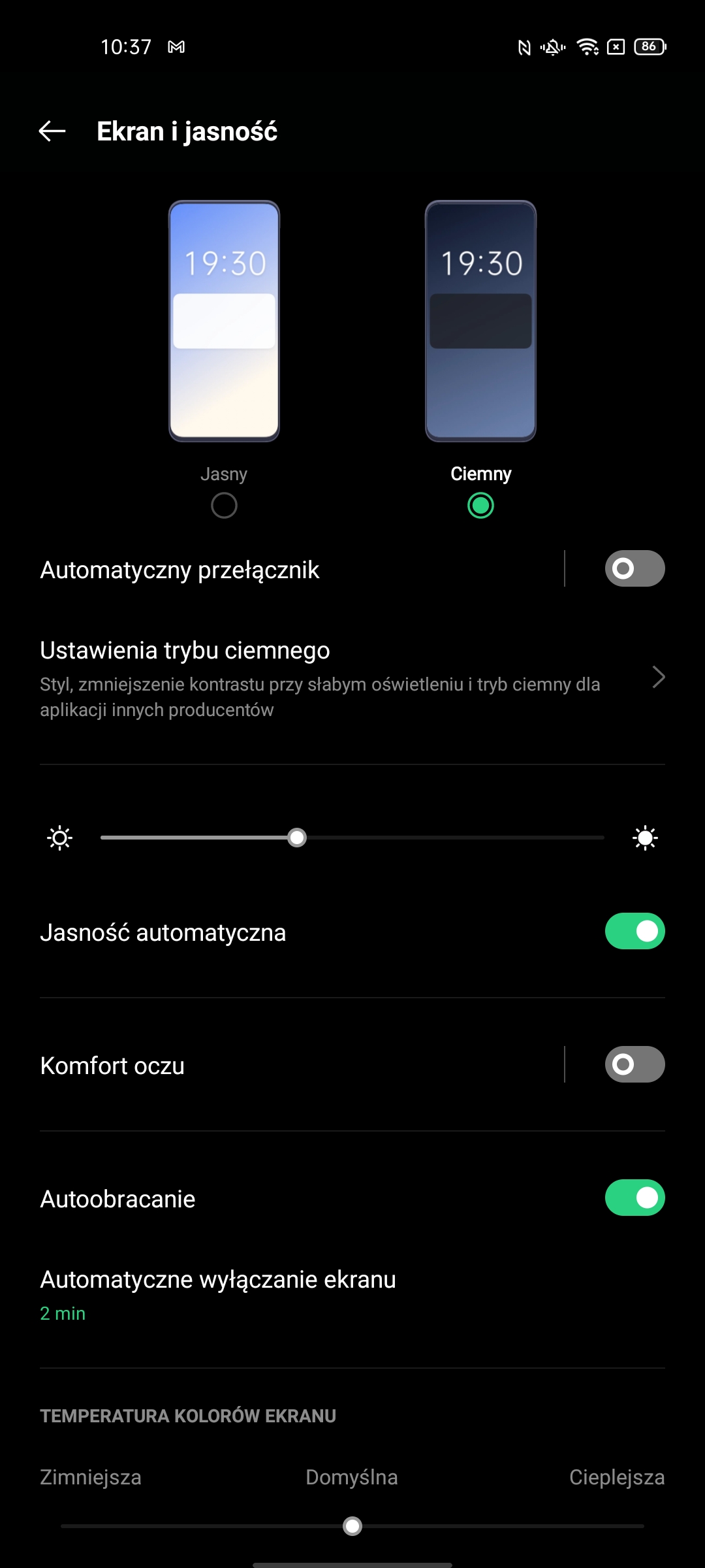 W ustawieniach ekranu jest ciemny motyw interfejsu, możliwość dostosowania skali interfejsu, rozmiaru czcionki, niebieski filtr. Dostępna jest funkcja redukcji migotania przy niskiej jasności i „efektu wizualnego OSIE”. Jest obecny we wszystkich smartfonach OPPO, ale nie można było zauważyć żadnych oczywistych ulepszeń na obrazie. Nie ma różnych trybów oddawania barw, ale jest możliwość ustawienie temperatury barwowej.