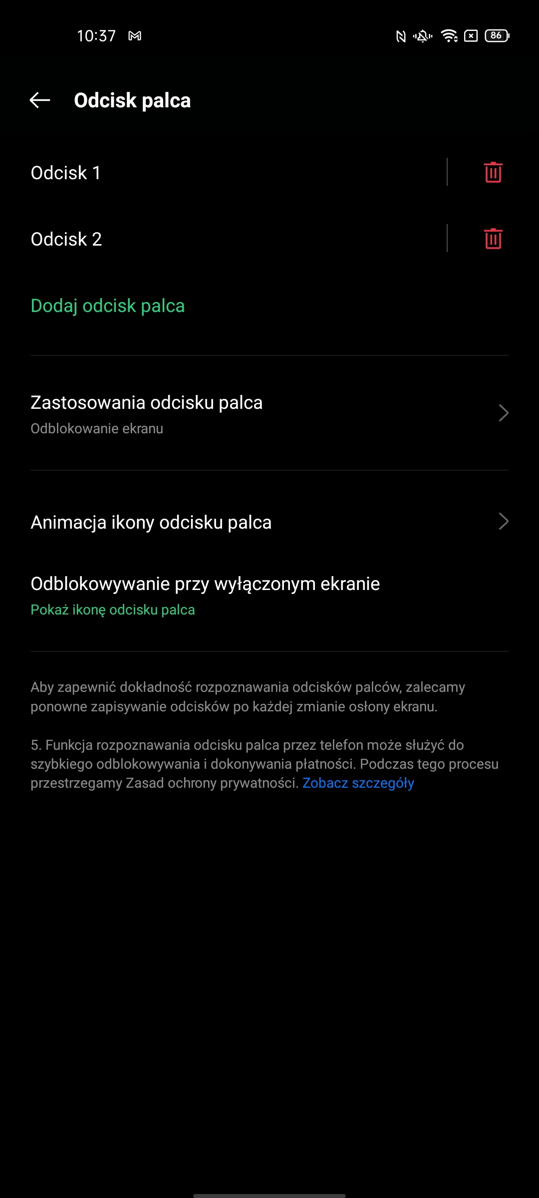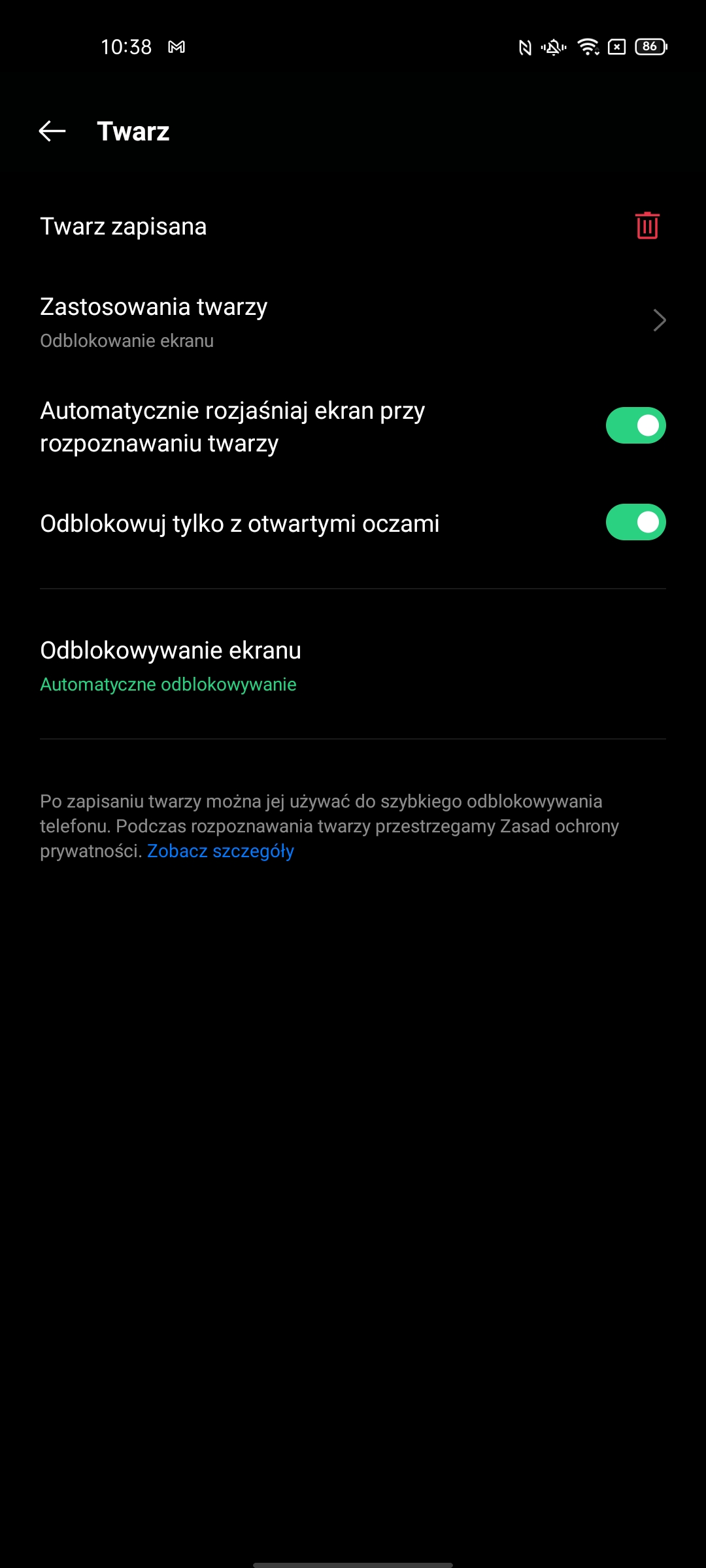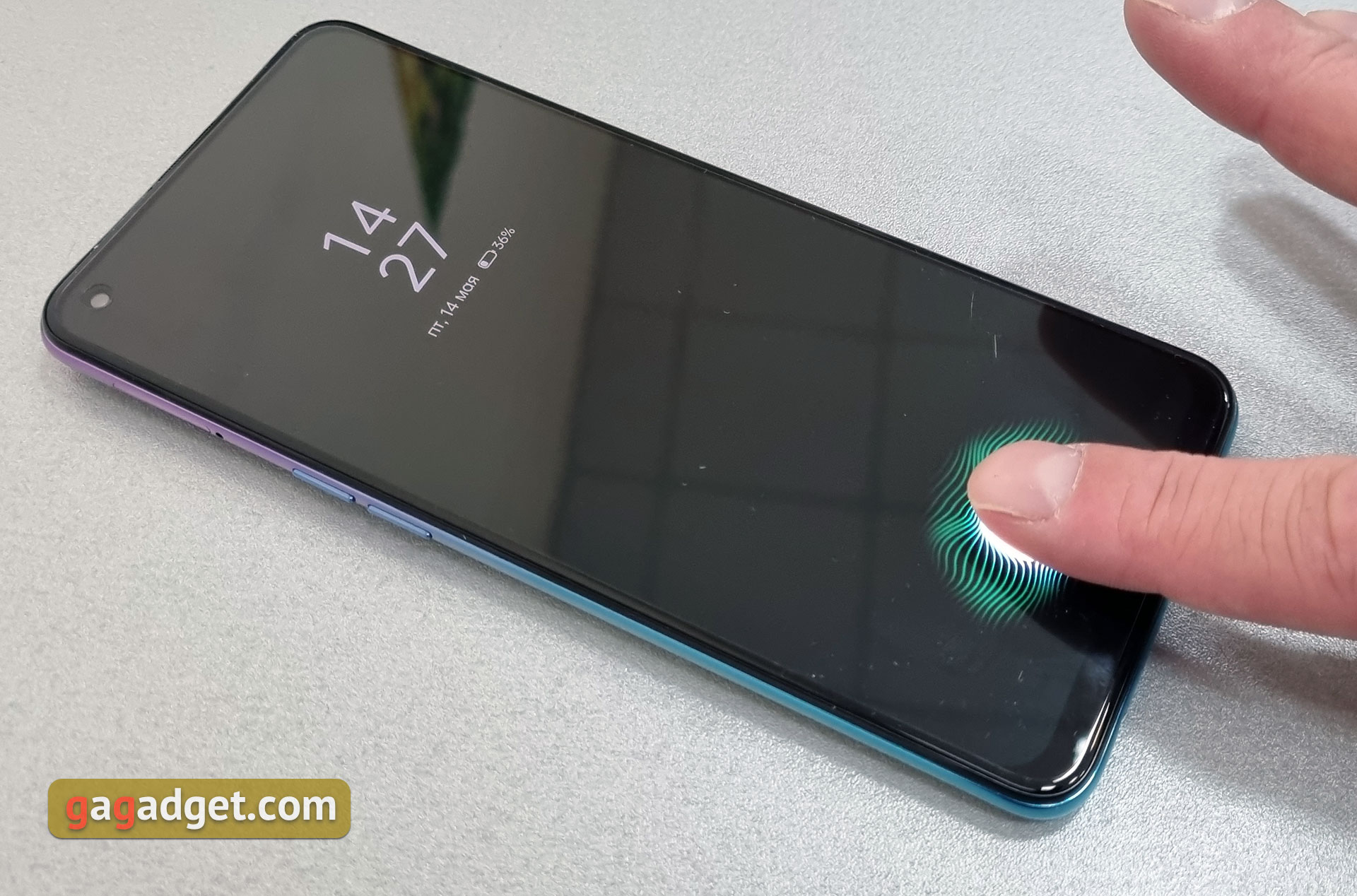 Zestaw podekranowego optycznego skanera linii papilarnych i rozpoznawania twarzy właściciela z przednim aparatem staje się już standardem dla smartfonów ze średniego segmentu cenowego. Jednym z takich smartfonów jest OPPO Reno5 Lite. Skaner działa dokładnie, ale pod względem szybkości reakcji jest nieco gorszy od klasycznych skanerów pojemnościowych. Do tej pory tylko skanery podekranowe w topowych modelach praktycznie dorównywały szybkością „klasykom”. Rozpoznawanie twarzy działa całkiem dobrze w dobrych warunkach oświetleniowych. Smartfon ma funkcję automatycznego zwiększania jasności wyświetlacza do rozpoznawania w ciemności, ale oszczędza to tylko częściowo, a nie w całkowitej ciemności.
