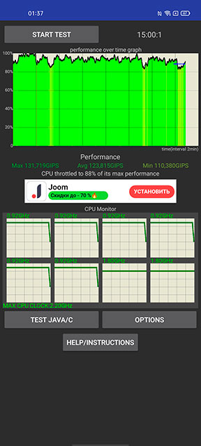Przy długotrwałych szczytowych obciążeniach wydajność może spaść nawet o 88%, co jest w granicach rozsądku. Jednocześnie korpus smartfona praktycznie się nie nagrzewa. Obszar w pobliżu aparatu lekko się nagrzewa.