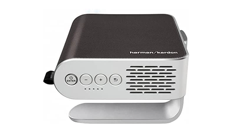Najbardziej kompaktowy projektor w moim zestawieniu posiada zintegrowaną podstawkę z regulowanym kątem nachylenia. Wbudowana bateria zapewnia do 6 godzin pracy. Może wyświetlać 100-calowy obraz z odległości 8 stóp i 9 cali, ale jeśli musisz pracować w zacienionym pomieszczeniu, 80 cali to limit. Warto również wspomnieć o wysokiej jakości głośnikach Harman/Kardon.
