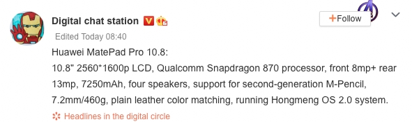 Nowość dopisuje jeszcze 8GB pamięci RAM, 128/256GB wbudowanej, 8MP kamerę frontową, 13MP aparat główny, baterię 7250mAh oraz wsparcie dla rysika M-Pen drugiej generacji. Tablet powinien działać z fabrycznie zainstalowanym systemem HarmonyOS 2.0.