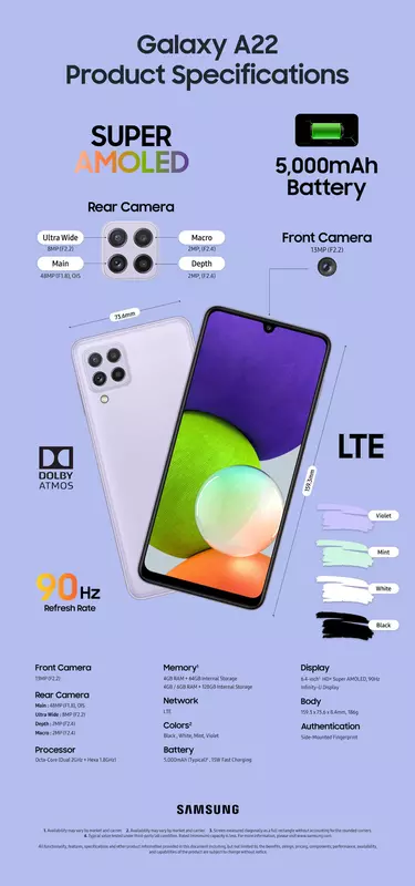 Jak dla zwykłego Galaxy A22, to nie obsługuje sieci piątej generacji w pierwszej kolejności. Ponadto, smartfon został wyposażony w 6,4-calowy ekran o rozdzielczości HD+ z matrycą AMOLED o częstotliwości odświeżania 90 Hz. W urządzeniu znajdziemy również prostszy układ MediaTek Helio G80, brak slotu microSD, 13-megapikselowy aparat przedni oraz główny z czterema modułami. Główny sensor ma rozdzielczość 48 MP i wsparcie OIS. Uzupełnia go szerokokątny obiektyw 8 MP, czujnik głębi 2 MP oraz obiektyw makro o tej samej rozdzielczości. Oba smartfony wyposażone są w baterie o pojemności 5000 mAh, zasilacze 15W oraz boczne skanery linii papilarnych. Nie wiadomo, czy nowości posiadają NFC.