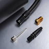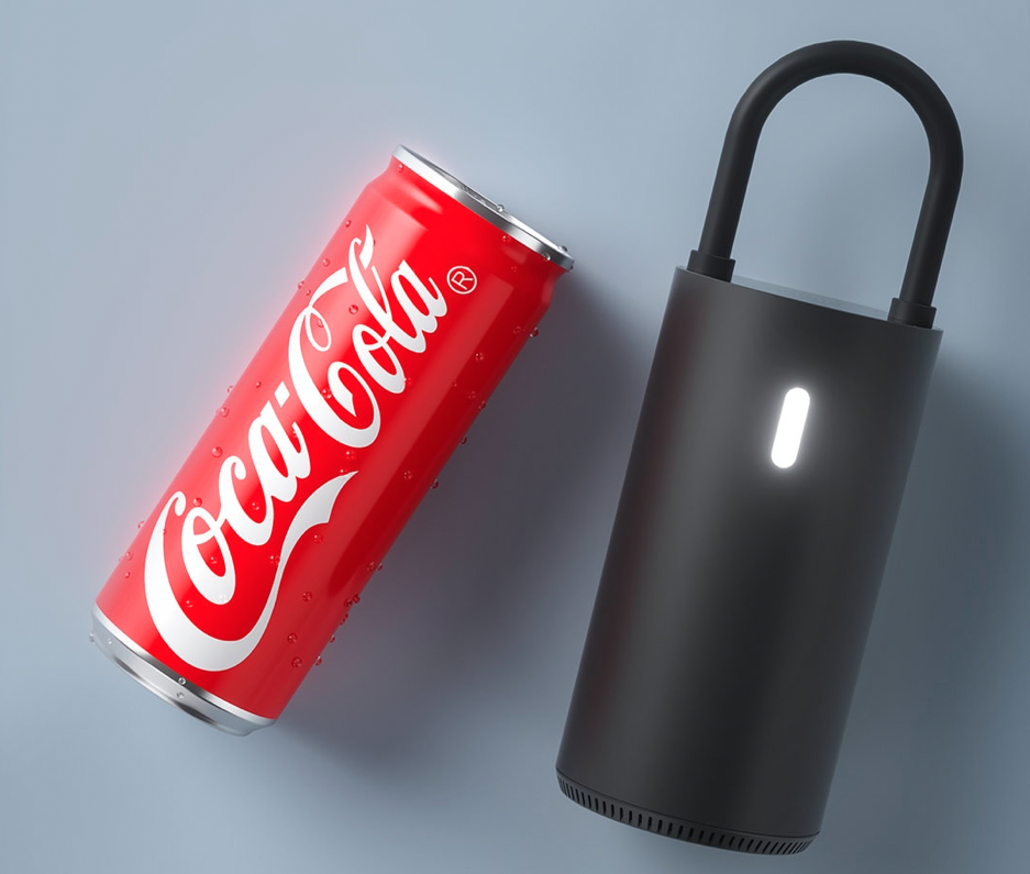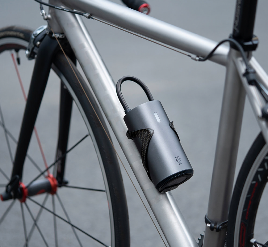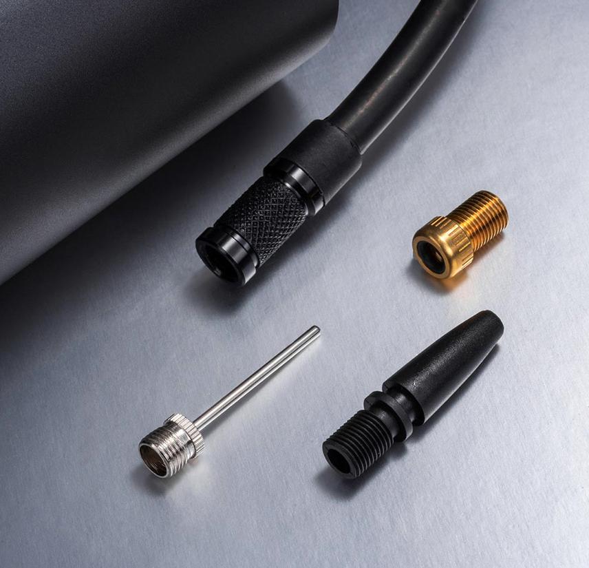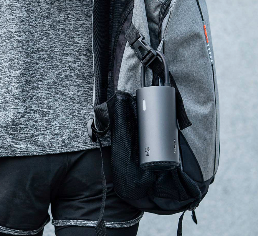 Na spodzie gadżetu znajdują się otwory wlotowe powietrza, wskaźnik zasilania, port ładowania USB-C oraz gumowana podkładka. Do pompki dołączony jest wąż 20cm z gwintem auto nipple na końcu. W zestawie znajdują się również adaptery do pompowania opon rowerowych oraz materac i piłka. Wszystkie te elementy można złożyć do etui, które jest dołączone do urządzenia.