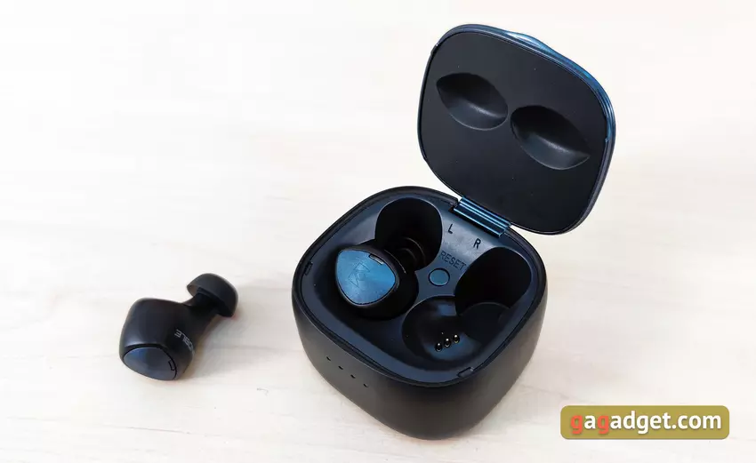 Po zamknięciu korpus ma samoczynne wykończenie i dobrze się trzyma w tym stanie. Wewnątrz etui wszystko jest prawie znajome: miejsca na słuchawki ze stykami do ładowania i magnesami do „dopasowania” do żądanej pozycji. Jak pokazała praktyka, konstrukcja nie jest najwygodniejsza: nie jest tak łatwo wyjąć słuchawki z etui. Przycisk resetowania znajduje się między słuchawkami, aby przywrócić ustawienia fabryczne.