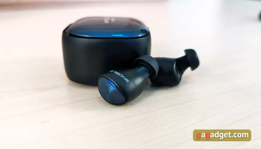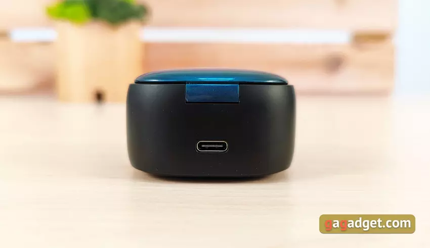 Etui ładujące nie jest najmniejsze. Ale można to wybaczyć, biorąc pod uwagę obsługę bezprzewodowego ładowania Qi. Wygląda interesująco i jest wykonany w tym samym stylu, co i słuchawki. Główna część to matowy czarny plastik, a wieczko jest błyszczące, niebieskie z nazwą modelu. Z przodu znajdują się cztery wskaźniki LED poziomu naładowania obudowy.