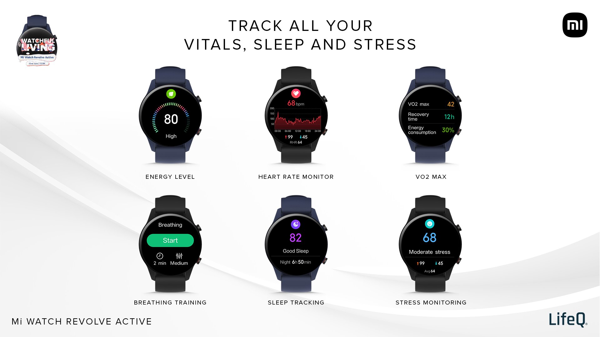 Nowość jest w stanie śledzić poziom tlenu we krwi (SpO2), sen, tętno, stres i wynik VO2 Max. Urządzenie posiada 117 trybów sportowych, 110 predefiniowanych tarcz zegarka oraz asystenta głosowego Amazon Alexa. Można go wykorzystać do sterowania innymi inteligentnymi urządzeniami firmy. Xiaomi Mi Watch Revolve Active jest wodoodporny (5ATM). Zegarek pokazuje czas, powiadomienia, pogodę i nie tylko.