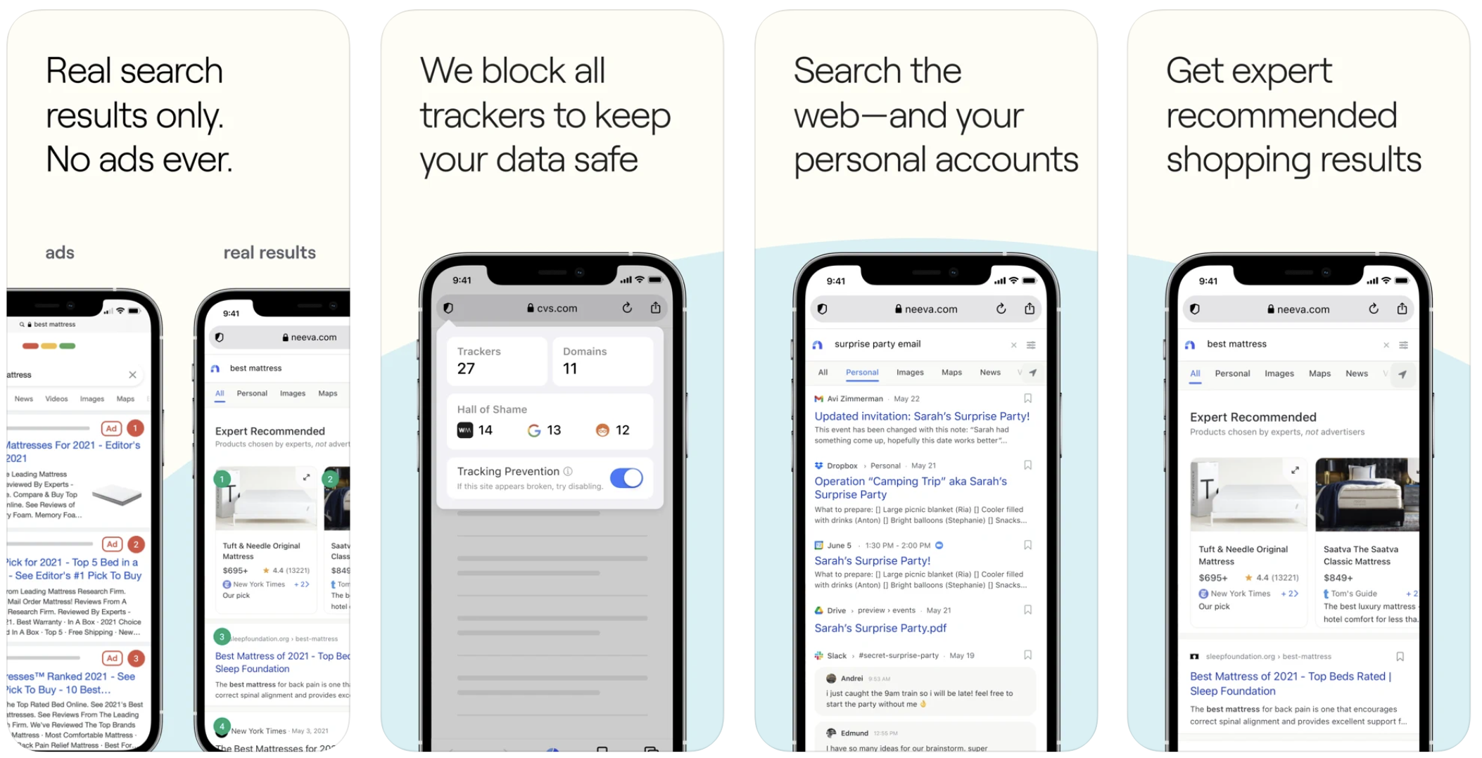 Neeva odróżnia się od innych wyszukiwarek tym, że nie ma w niej reklam. Nie posiada również wbudowanych trackerów, które śledzą aktywność użytkownika.