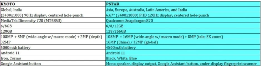 W nowej linii znajdą się cztery urządzenia. Nowe maszyny noszą nazwy kodowe Berlin, Berlin NA, Pstar i Kyoto. Pierwsze dwa modele są do siebie podobne. Otrzymają one układy Snapdragon 778G, 6/8GB RAM, 128/256GB ROM oraz przednie kamery z sensorami OmniVision OV32B40. Jeśli chodzi o główny, berliński będzie miał 108-megapikselowy sensor Samsung S5KHM2. Uzupełni go szerokokątny obiektyw OmniVision 16 MP (OV16A10) oraz 8 MP telewizor OmniVision OV08A10. Berlin NA z kolei dostanie aparat 108 MP + 8 MP + 2 MP. Pierwszy smartfon zostanie wydany w Europie, a drugi w USA.