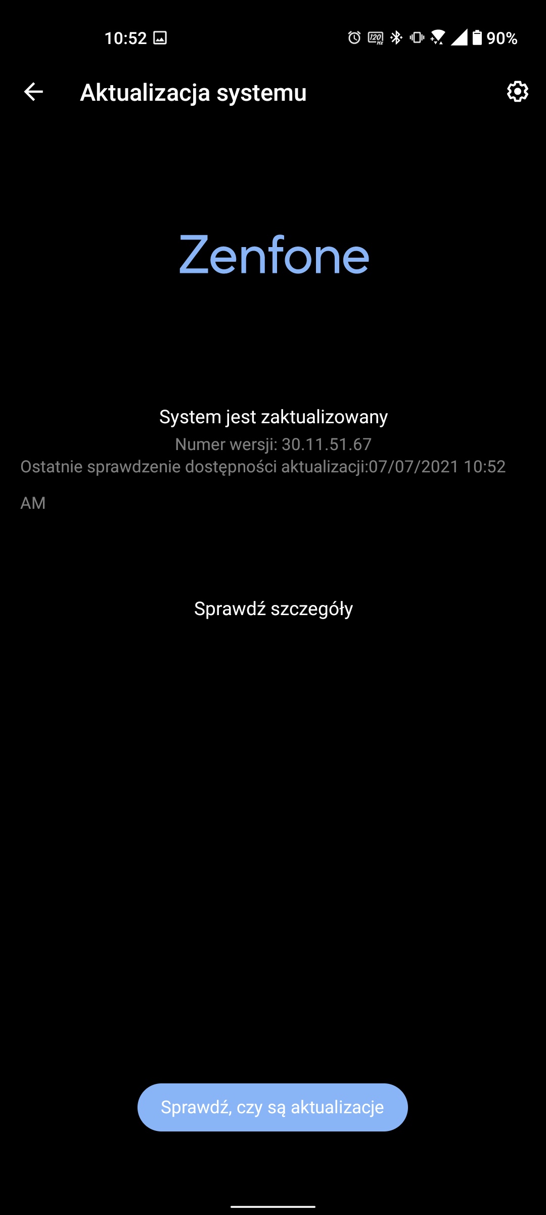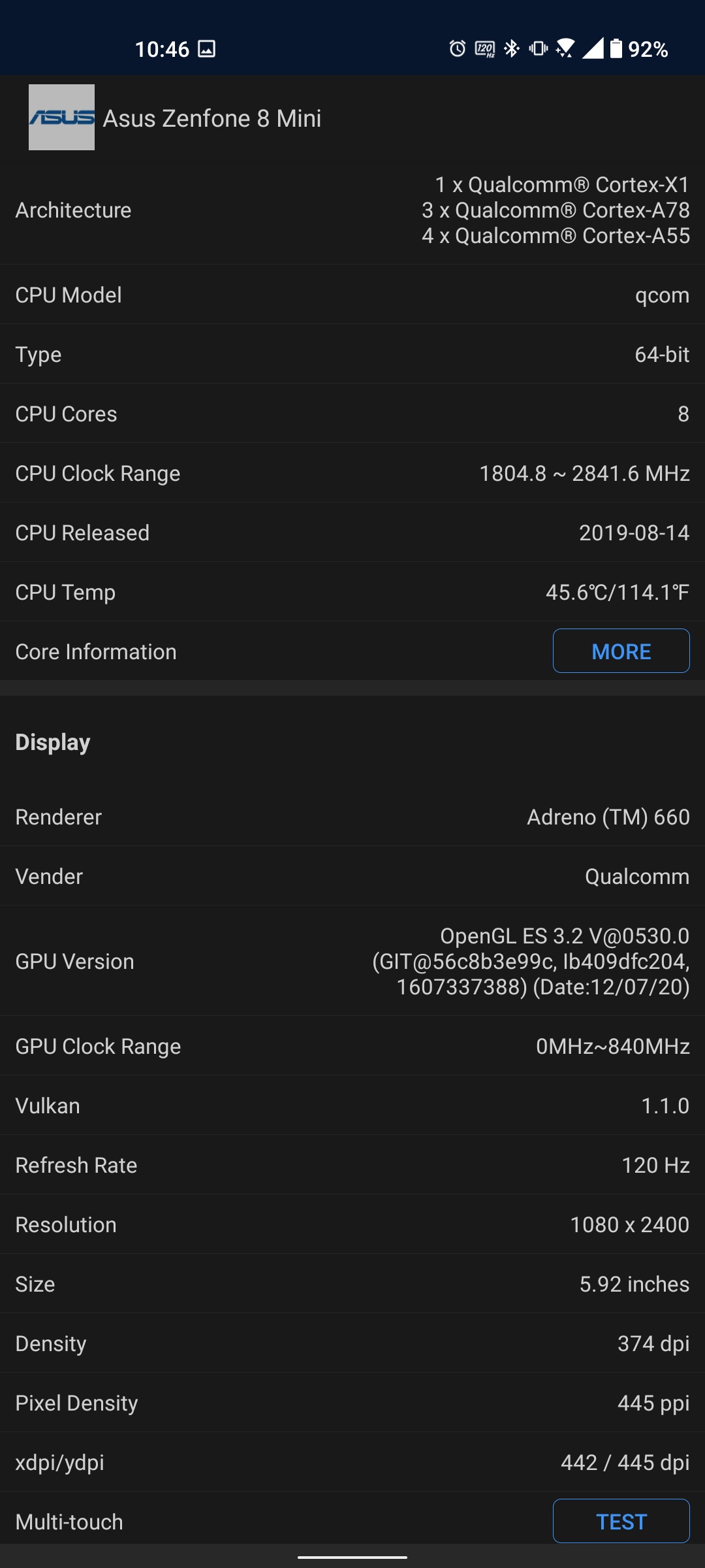 5,9-calowy ekran ASUS ZenFone 8 ma rozdzielczość FullHD+ (2400x1080). Proporcje obrazu to 20:9, a gęstość pikseli to około 449 ppi. Zastosowano matrycę Samsung SuperAMOLED z maksymalną częstotliwością odświeżania 120 Hz i czasem reakcji czujnika 1 ms. Obsługiwane są standardy HDR10 i HDR10+, szczytowa jasność wynosi 1100 cd/m2, a gama kolorów to 112% przestrzeni kolorów DCI-P3. Ustawienia mają wszystko, czego potrzebujesz: przełączanie częstotliwości odświeżania (120, 90, 60 Hz lub tryb automatyczny), ciemny motyw, dostosowanie skali elementów interfejsu, czcionkę, tryby kolorów Always on Display, Splendid i DC Dimming (działa tylko przy 60 Hz). Warto zauważyć, że smartfon posiada szereg trybów wydajności. A co najwyżej na siłę stosuje się częstotliwość 120 Hz. Inne tryby stają się niedostępne.