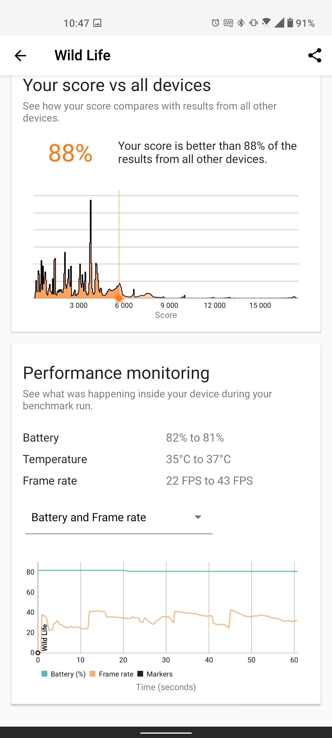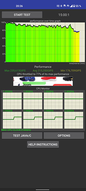 Ale z chłodzeniem smartfona sprawy nie są zbyt dobre. W teście warunków skrajnych w trybie maksymalnej wydajności smartfon bardzo wyraźnie się nagrzewa, procesor dławi się i pod koniec testu wydajność spada do 77%. Podczas normalnego użytkowania występuje ciepło, ale obserwuje się je tylko podczas długich sesji grania.