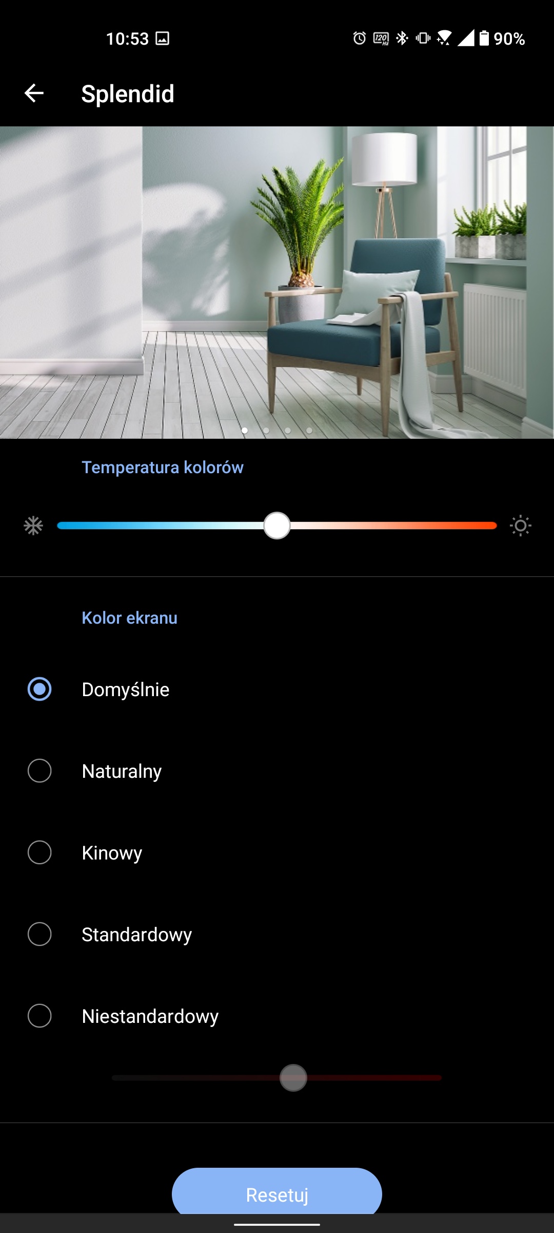 W trybie „Kinowy” maksymalna jasność jest nieco niższa: 429,937 cd/m². Gama kolorów jest wizualnie węższa niż w trybie „Naturalny”, ale wyświetlanie kolorów jest bardziej naturalne, znacznie bliższe wartościom referencyjnym. Istnieje tendencja do zimnych odcieni, ale nieistotna: