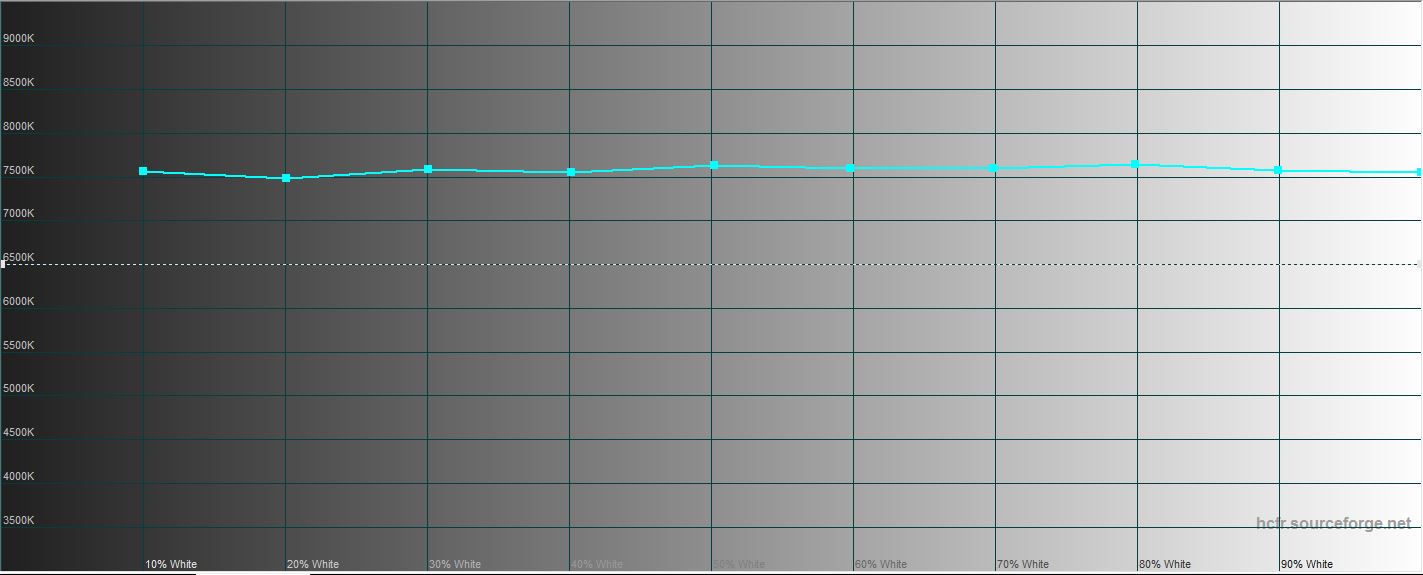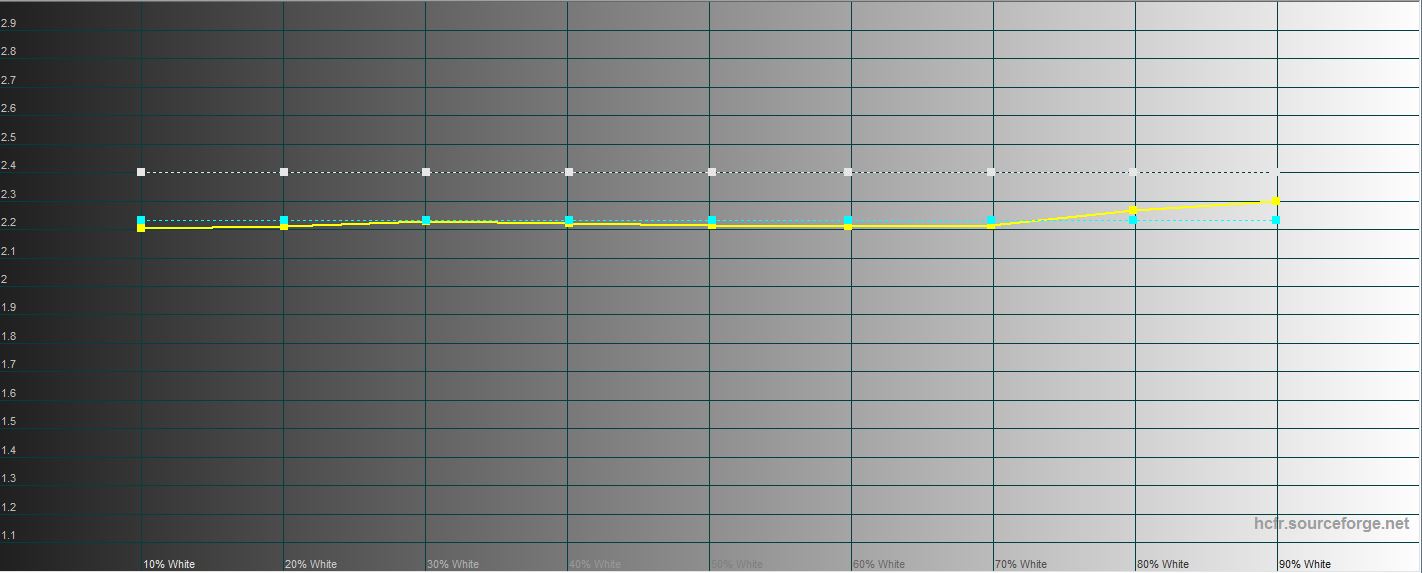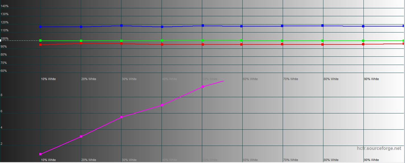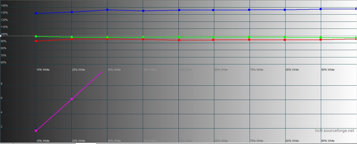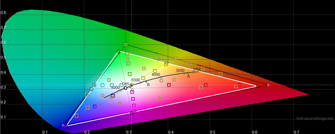 W trybie „Kinowy” maksymalna jasność jest nieco niższa: 429,937 cd/m². Gama kolorów jest wizualnie węższa niż w trybie „Naturalny”, ale wyświetlanie kolorów jest bardziej naturalne, znacznie bliższe wartościom referencyjnym. Istnieje tendencja do zimnych odcieni, ale nieistotna: