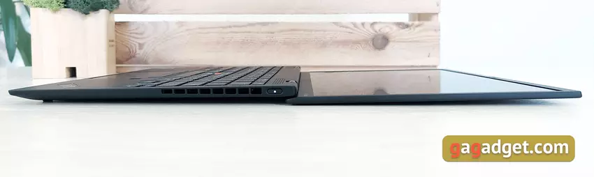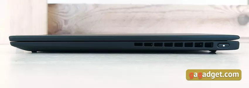 Ale w przeciwieństwie do „większych” przedstawicieli linii, Lenovo ThinkPad X1 Nano otrzymał bardzo skromny zestaw portów. Po prawej stronie laptopa nie ma ich wcale. A z użytecznego jest tylko przycisk zasilania ze wskaźnikiem LED i otworami wentylacyjnymi: