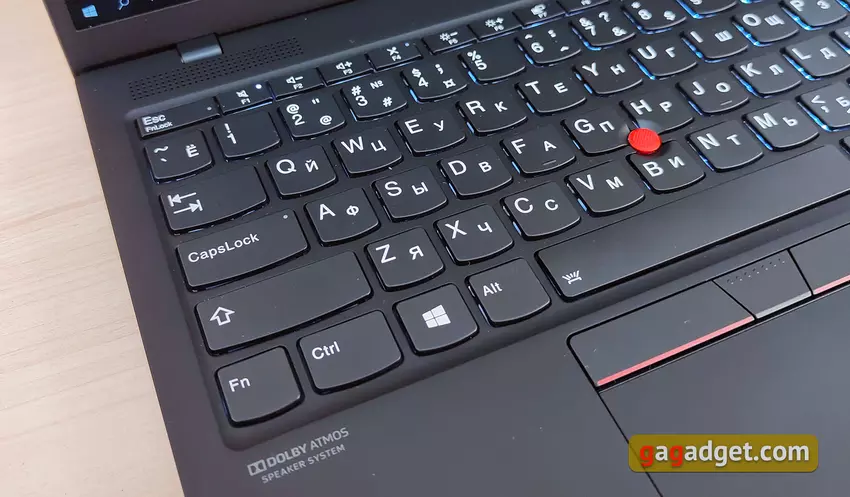 Laptop można łatwo otworzyć jedną ręką. Jednocześnie zawiasy wystarczająco pewnie mocują wyświetlacz i nie zaczyna on wibrować przy najmniejszym dotknięciu. Maksymalny kąt otwarcia laptopa to 180°. Układ klawiatury to standardowy ThinkPad, ale same przyciski są nieco inne. Z funkcji układu: zamieniono lewy klawisz Ctrl i Fn, co może nie być zbyt wygodne. Ale w ustawieniach możesz go zwrócić. Oddzielne przyciski Home, End i Delete znajdują się na końcu górnego rzędu, blok strzałki jest lekko wysunięty w kierunku użytkownika, a klawisze PgUp i PgDn znajdują się po bokach strzałki w górę. Jednocześnie PrtSc znajduje się pomiędzy prawym Alt i Ctrl. Przy przejściu z laptopa innego producenta przyzwyczajenie się do tego zajmie trochę czasu, ale nic krytycznego.