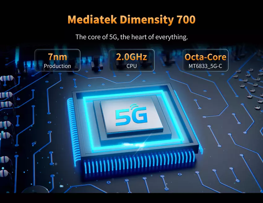 .Urządzenie posiada 6,52-calowy ekran IPS o rozdzielczości 1600×720p oraz wodoodporną obudowę MIL-STD-810G i IP68/IP69K. Pod maską nowego produktu znajduje się układ MediaTek Dimensity 700. SoC zbudowany jest w 7nm procesie technologicznym i zawiera zintegrowany modem 5G, a także dwa wydajne rdzenie ARM Cortex-A76 taktowane maksymalną prędkością 2.2GHz oraz sześć energooszczędnych rdzeni ARM Cortex-A55 taktowanych zegarem 2.0GHz. Układ jest sparowany z 8GB pamięci RAM i 128GB pamięci masowej. W razie potrzeby można go rozszerzyć za pomocą karty pamięci.