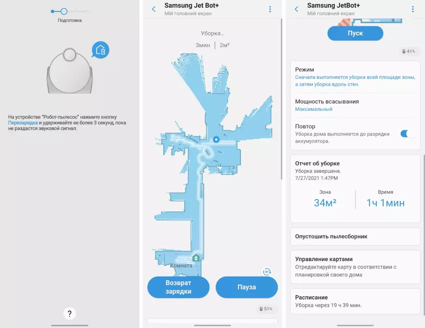 Odkurzacz Samsung Jet Bot+ posiada trzy tryby czyszczenia. Pierwszy, najdokładniejszy, odkurzacz, poruszając się ruchem wężowym, najpierw czyści całą powierzchnię, potem idzie wzdłuż ścian, a następnie jeszcze bada obszary wokół przeszkód. Drugi jest odwrotny - najpierw idzie wzdłuż ścian, a potem czyści pomieszczenie. Trzeci i najszybszy tryb to po prostu węże wokół i powrót do bazy domowej.