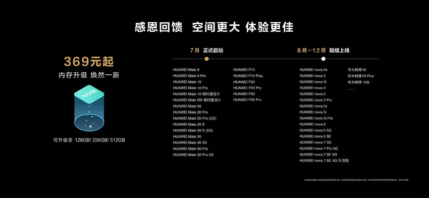 Właściciele starszych modeli, które nie mają tyle pamięci, ile by chcieli będą mogli zwiększyć ilość pamięci masowej do 128, 256 lub 512 GB. Po pierwsze, aby zrobić miejsce dla systemu Harmony OS bez utraty cennych plików. aby rozszerzyć pamięć, należy skontaktować się z centrum serwisowym. Usługa nie jest bezpłatna - kosztuje około 57 dolarów. To prawda, istnieje konkretny harmonogram aktualizacji i lista urządzeń, które mogą uczestniczyć w programie.
