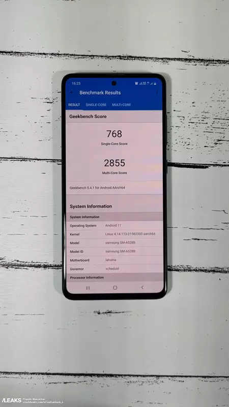 Pierwsze zdjęcie przedstawia typowy smartfon z 2020 lub 2021 roku - duży wyświetlacz, stosunkowo wąskie ramki ekranu i otwór na przednią kamerę. Drugie zdjęcie przedstawia Samsunga Galaxy A52s uchwyconego z otwartą aplikacją Geekbench 5. Wynik w teście jednego rdzenia to 768 punktów, natomiast w trybie wielordzeniowym model ten uzyskał 2855 punktów.