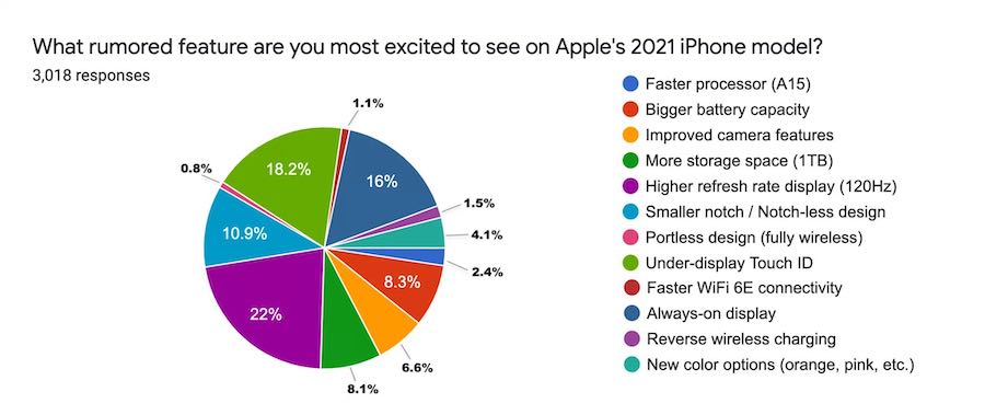 22%respondentów jest podobno najbardziej zainteresowanych pojawieniem się wyświetlacza o wysokiej częstotliwości odświeżania 120 Hz w linii produkcyjnej iPhone'a 13. 18.2%Respondenci mają nadzieję na Touch ID pod wyświetlaczem, ale mogą być rozczarowani, ponieważ najnowsze doniesienia sugerują, że funkcja ta pojawi się w nowych modelach iPhone'ów najwcześniej w 2023 roku. 16%oczekuje "zawsze włączonego" wyświetlacza, a 10,9%jest podekscytowanych perspektywą mniejszego wycięcia.