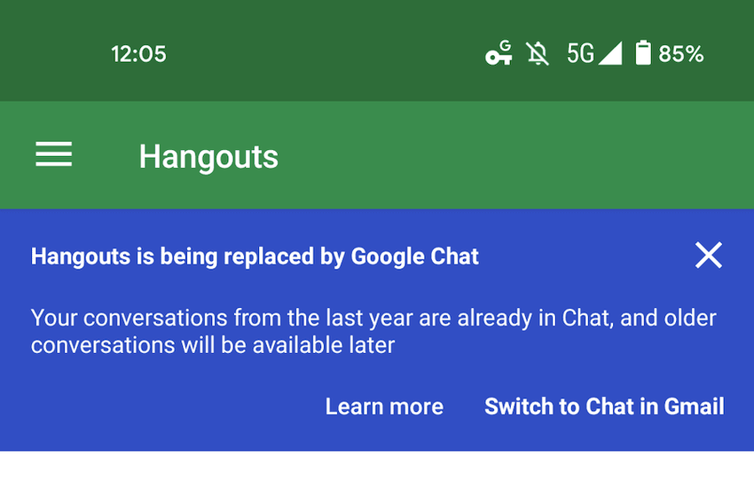 Google rozpoczyna przejście do aplikacji Google Chat, zmuszając użytkowników do opuszczenia swoich kont Hangouts. Brak możliwości korzystania z ich kont jak dotychczas oznacza koniec Google Hangouts jako usługi czatu. Przedsiębiorstwa będą jednak mogły korzystać z aplikacji do końca 2021 roku.