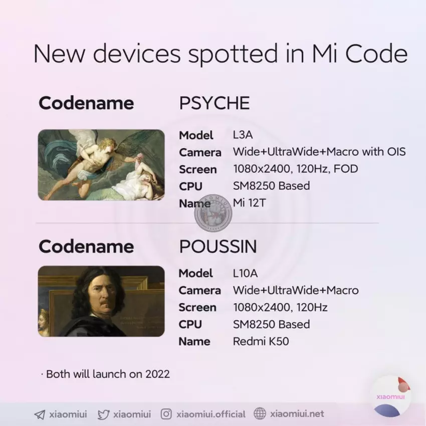 Informacje o tych dwóch modelach zostały znalezione w źródłach Mi Code. Xiaomi Mi 12T nosi nazwę kodową Psyche, natomiast Redmi K50 nosi nazwę kodową Poussin. Oczekuje się, że smartfony zostaną ogłoszone w 2022 roku, więc plotka powinna być brana z ziarnem sceptycyzmu.