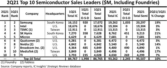 Raport mówi, że sprzedaż półprzewodników w drugim kwartale z 10 największych firm wzrosła o 10% w porównaniu z poprzednim kwartałem do 95,5 miliardów dolarów, przewyższając ogólny średni wzrost przemysłu o 8%.