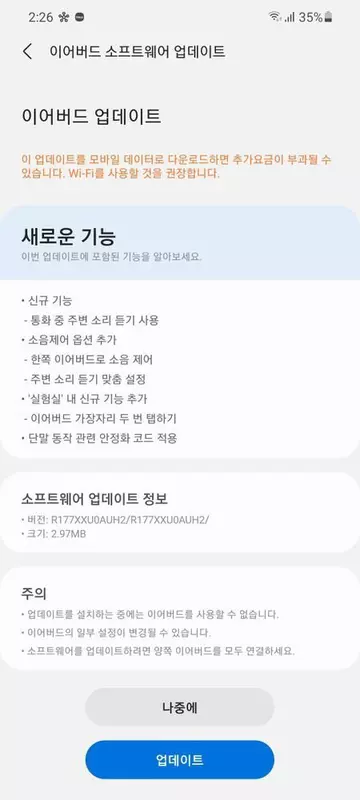 System ma numer budowy R177XXU0AUH2 i jak na razie został wydany tylko w Korei Południowej. Główną nowością jest możliwość włączenia trybu "przezroczystości" (aka Ambient Sound) podczas rozmów. Po aktualizacji pojawiła się również możliwość aktywacji systemu redukcji szumów (ANC) za pomocą jednej słuchawki, a także możliwość rekonfiguracji podwójnego stuknięcia w krawędzie w celu regulacji głośności. Aktualizacja powinna być dostępna w innych regionach w najbliższych dniach.