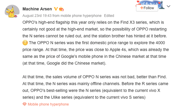 Według przecieku, odrodzona gama urządzeń będzie konkurować z tanimi flagowymi smartfonami. Takie urządzenia będą kosztować w okolicach 4000 juanów (ok. 620 USD). Oznacza to, że seria N zostanie umieszczona pomiędzy seriami Reno i Find X.