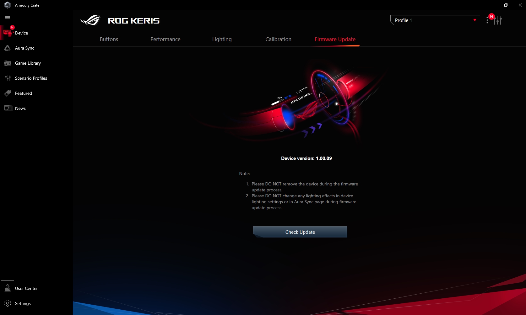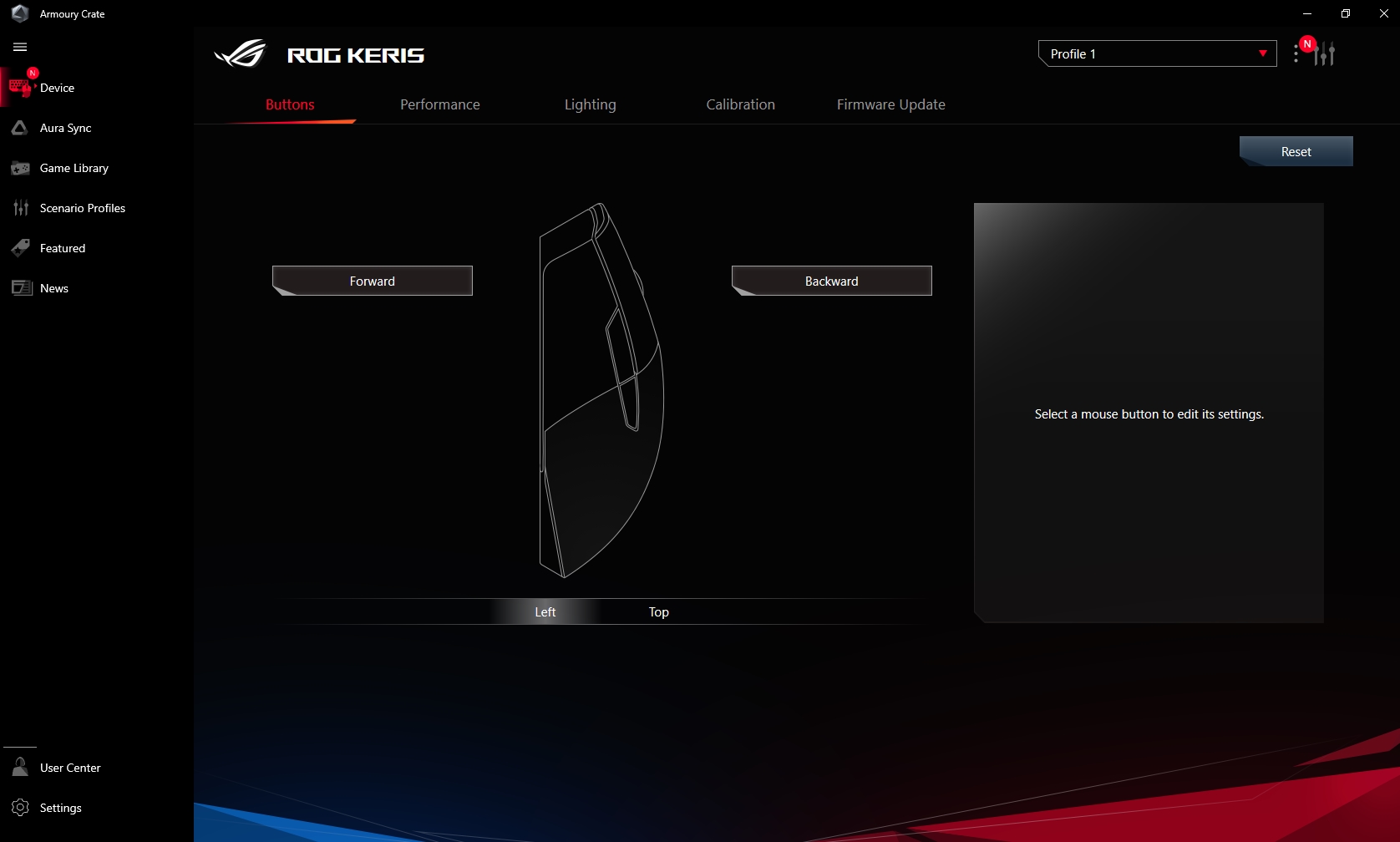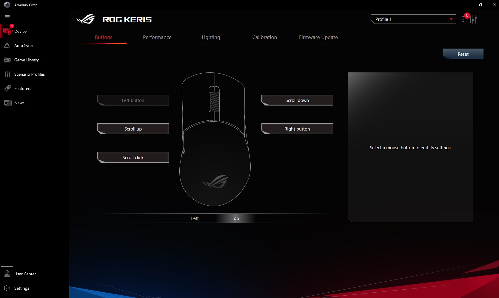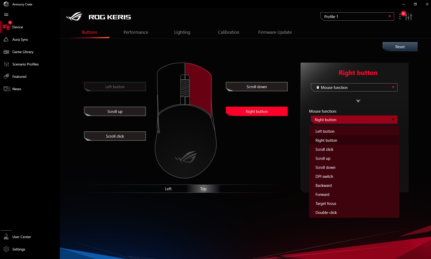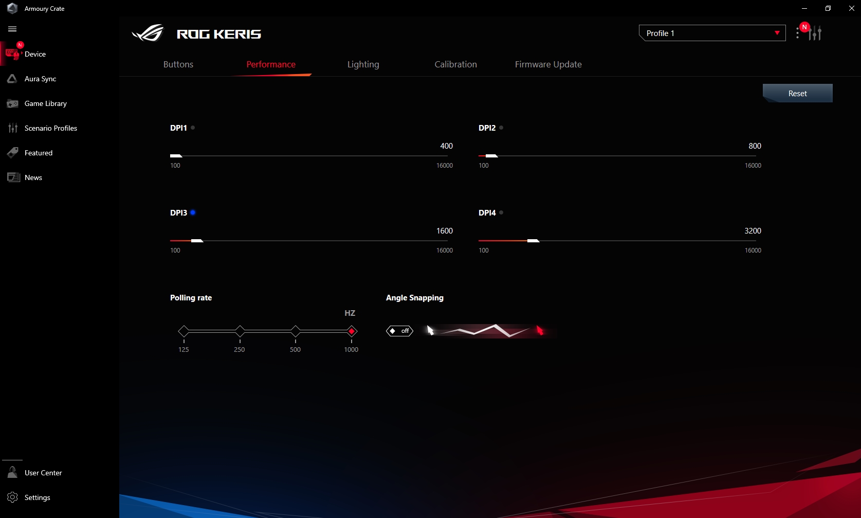 Aby szybko zmienić poziomy DPI, możesz użyć przycisku na spodzie myszy. Można zapisać 4 wartości. Tradycyjna, zastrzeżona aplikacja Armoury Crate służy do pełnego dostosowania ASUS ROG Keris. Posiada możliwość ponownego przypisania akcji do każdego przycisku, dostosowania czterech poziomów rozdzielczości, szybkości odpytywania, podświetlenia (w tym obsługi synchronizacji AURA), regulacji wysokości podnoszenia i kalibracji myszy w zależności od użytej powierzchni. Dostępne są ustawienia wstępne dla powierzchni ASUS, a także kalibracja dla wszystkich innych.