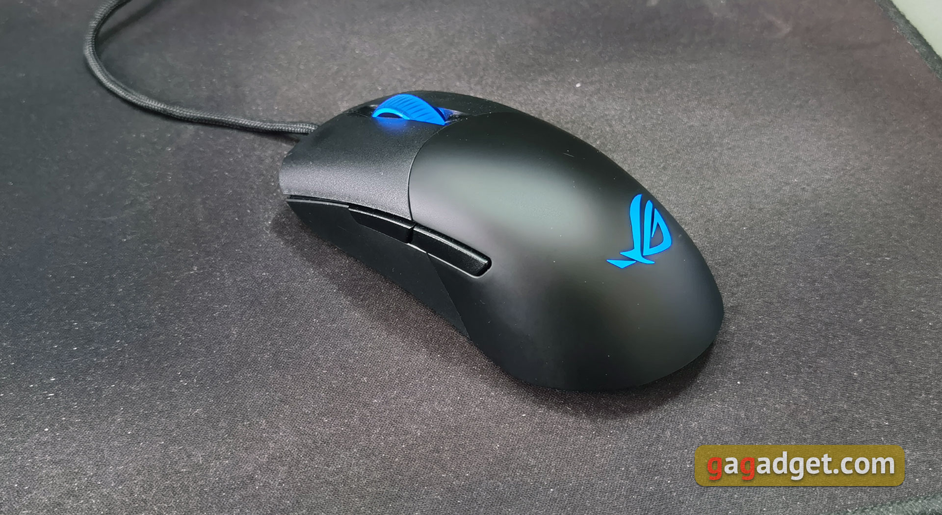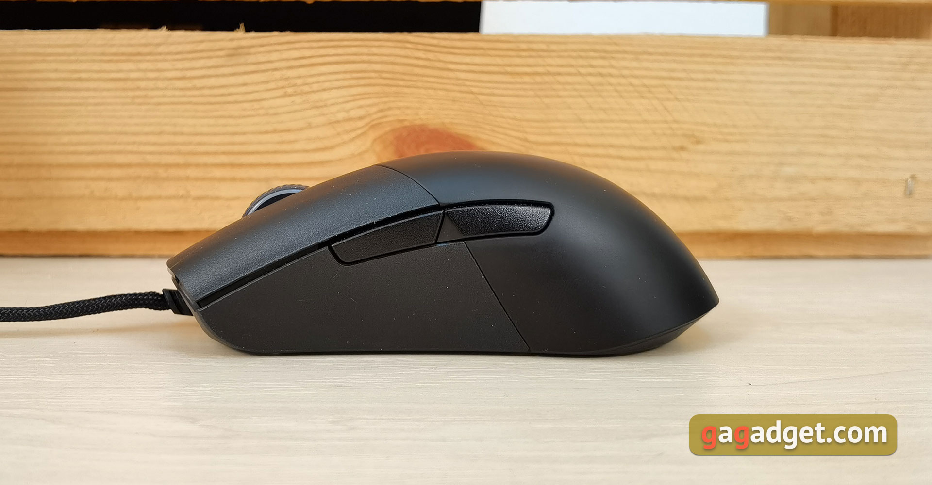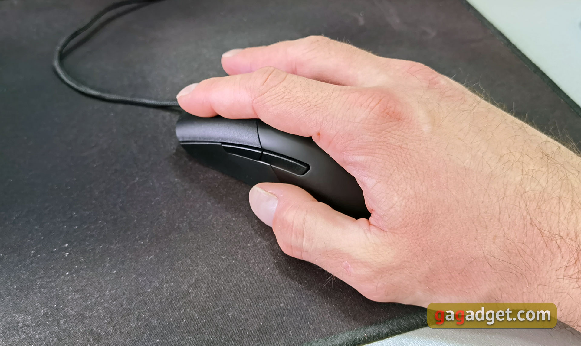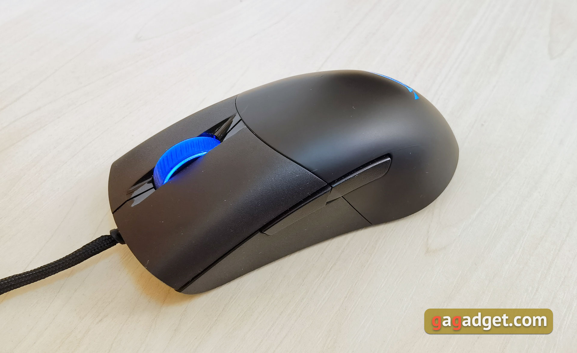 ASUS ROG Keris to dość kompaktowa mysz, która nadaje się przede wszystkim dla posiadaczy małych rączek. Nie nadaje się zbyt dobrze do chwytu dłoniowego (z wyjątkiem bardzo małej dłoni), a w szczególności do chwytu palcowego, pasuje idealnie. Zwłaszcza biorąc pod uwagę niską wagę. Jest bardzo łatwa i wygodna w użyciu. Rozkład ciężaru ROG Keris jest doskonały: mysz nigdzie się nie toczy, gdy opuszcza powierzchnię. Jedynym zarzutem jest to, że chciałbym mieć tłoczone lub gumowane boki: palce okresowo zsuwają się z prawego końca.