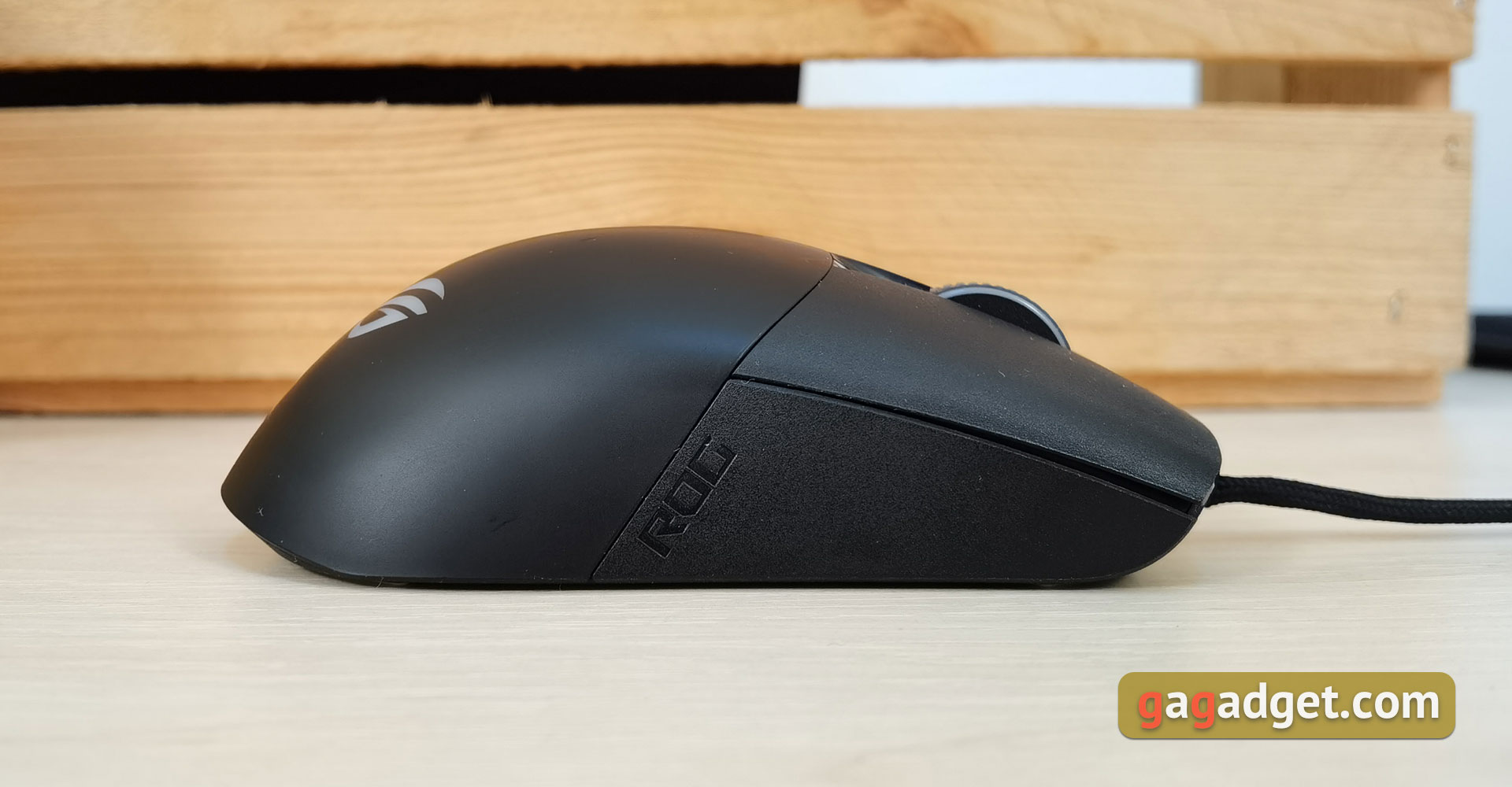 Plastikowe panele boczne nie mają żadnych dodatkowych gumowanych lub teksturowanych wstawek poprawiających położenie ręki. Po lewej stronie znajdują się dwa duże dodatkowe przyciski, po prawej tylko logo ROG.