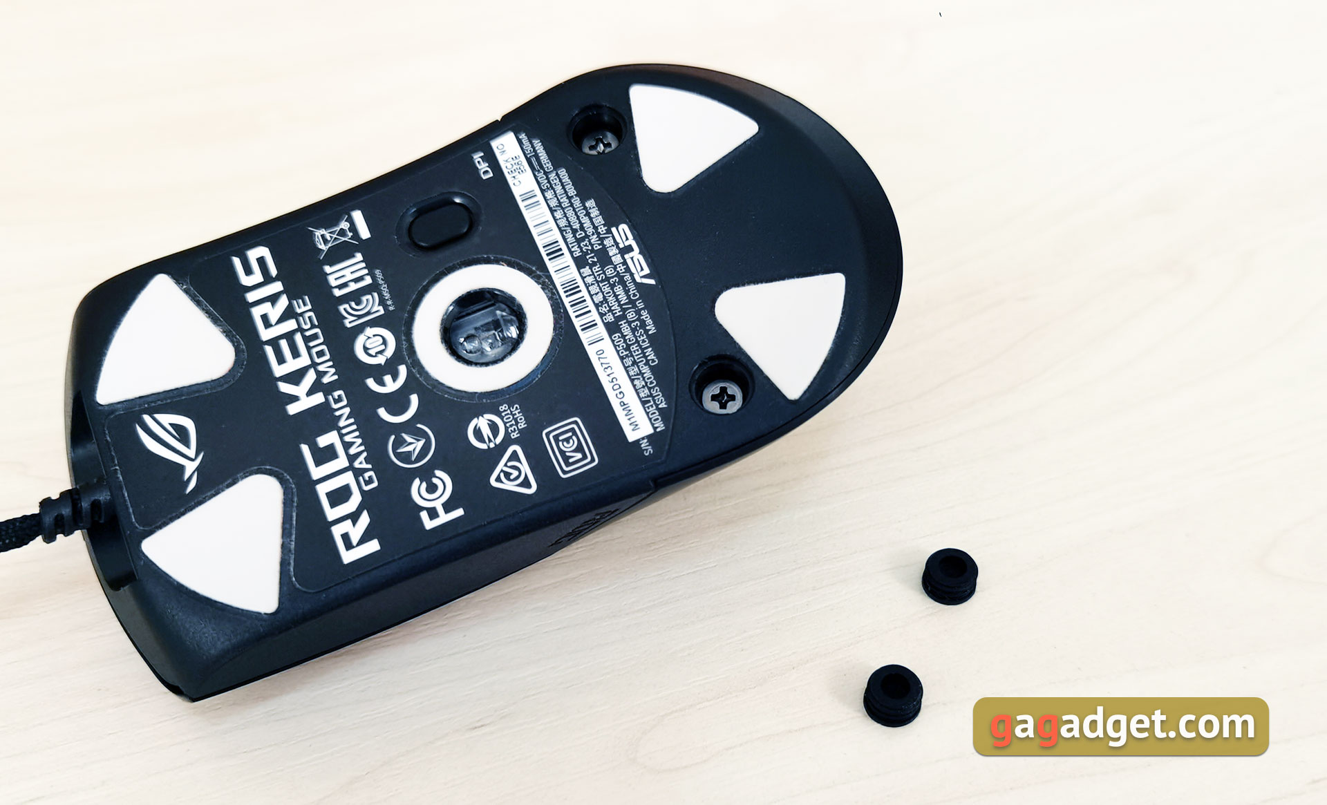 Na spodzie myszy znajdują się cztery trójkątne teflonowe nóżki ROG Omni Mouse w kolorze białym. Przy każdym znajduje się małe zagłębienie ułatwiające ich wydobycie i zastąpienie nowymi. Kolejna wkładka teflonowa znajduje się wokół okienka czujnika optycznego PixArt PMW3389. Obok znajduje się przycisk przełącznika DPI. A pod dwoma okrągłymi gumowymi zatyczkami znajdują się śruby, które należy odkręcić, aby zdjąć górną pokrywę podczas wymiany przełączników.