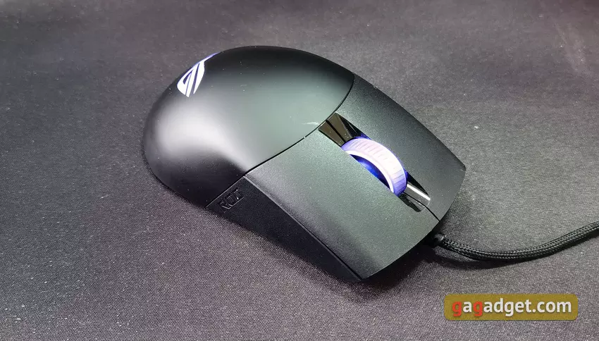 Kółko przewijania ma gumowaną powłokę z ukośnymi nacięciami. Jest w pełni oświetlone, jak w ROG Gladius III, która już była przez nas testowana. Chociaż w większości myszy do gier podświetlone są tylko boki. Wygląda to dobrze lub źle - każdy sam decyduje. Co więcej, podświetlenie można całkowicie wyłączyć.