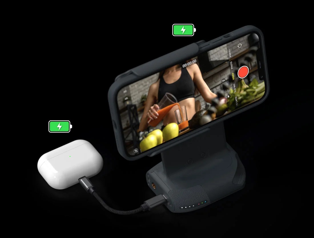 Ale i to nie wszystko . ShiftCam ProGrip ma wbudowaną baterię i może naładować martwy smartfon i nawet inne urządzenia. Bezprzewodowe ładowanie jest dostępne przy 15W i przewodowe przy 20W. Co więcej, możesz jednocześnie ładować zarówno swój telefon, jak i inny gadżet (np. słuchawki bezprzewodowe), używając