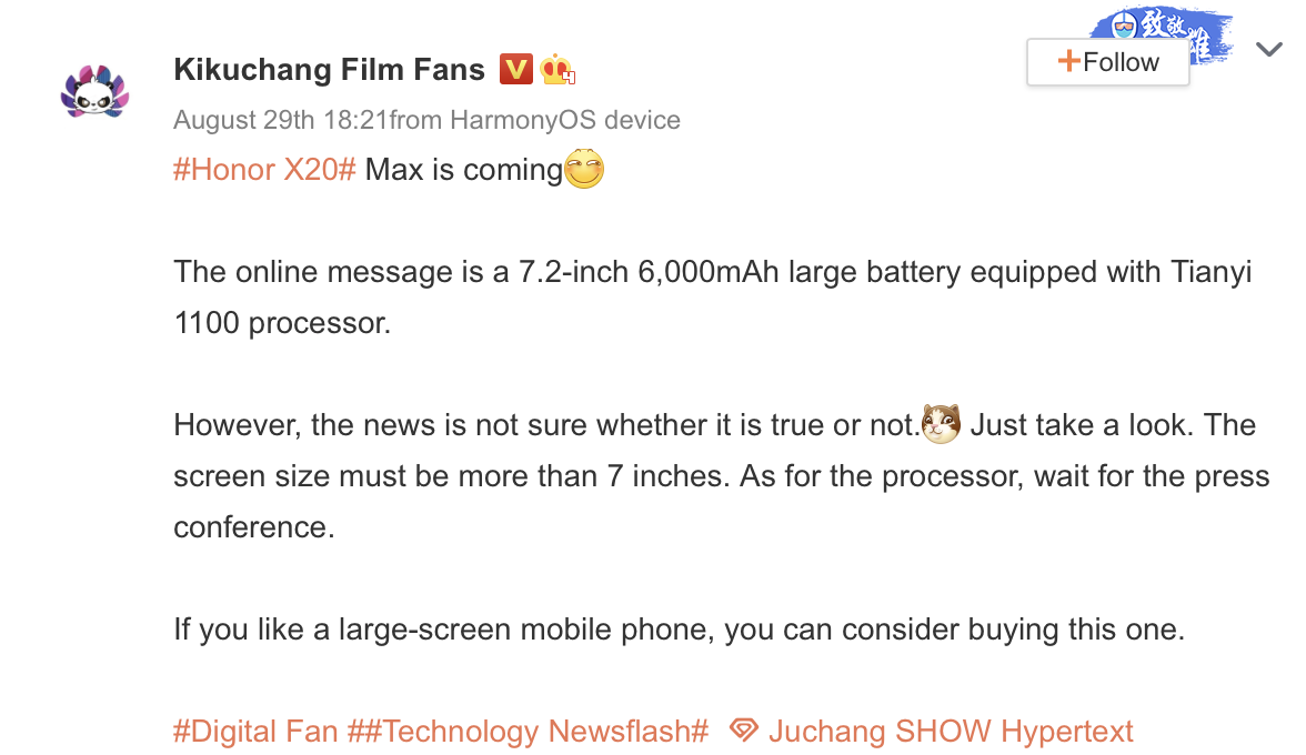 Według insidera z sieci społecznościowej Weibo, urządzenie będzie się nazywać Honor X20 Max. Jeśli wierzyć przeciekowi, będzie on wyposażony w duży, 7,2-calowy wyświetlacz. Oczekuje się, że ekran otrzyma wsparcie dla wyższych częstotliwości odświeżania. Nawiasem mówiąc, zamiast tradycyjnego panelu RGB, Honor X20 Max, jest przypisywany z wyświetlaczem RGBW. Dodatkowy subpiksel W (biały) zmniejsza zużycie energii przez panel przy wyświetlaniu koloru białego. Taki sam ekran znajdziemy w modelu Honor X10 Max 5G.
