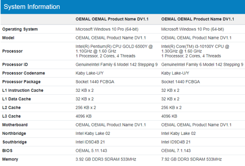 Urządzenie zostało dostrzeżone w bazie testów wydajności Geekbench. Sądząc po przecieku, gadżet zostanie wydany w dwóch wersjach. Podstawowy model otrzyma 4GB RAM i nowy układ Pentium Gold 6500Y. Jest on zbudowany w 14nm procesie technologicznym i pracuje z częstotliwością 3.4GHz, a towarzyszy mu grafika UHD 615. Nowość punktuje Geekbench 3197 punktów w teście jednordzeniowym i 5643 punktów w teście wielordzeniowym. Dla porównania, Surface Go 2 z układem Intel Core m3-8100Y ma mniej "papug" - odpowiednio około 2 tys. i 4 tys.