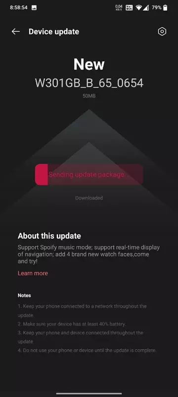Producent udostępnił aktualizację dla zegarka OnePlus Watch W301GB_B_65_0654. Dodano cztery nowe tarcze zegarka, a także tryb Spotify Music Mode, który pozwala na synchronizację list odtwarzania na zegarku. Ponadto, w urządzeniu dodano podpowiedzi nawigacyjne oraz kontrolę wibracji dla przychodzących powiadomień. Twórcy aplikacji poprawili również funkcję monitorowania snu.