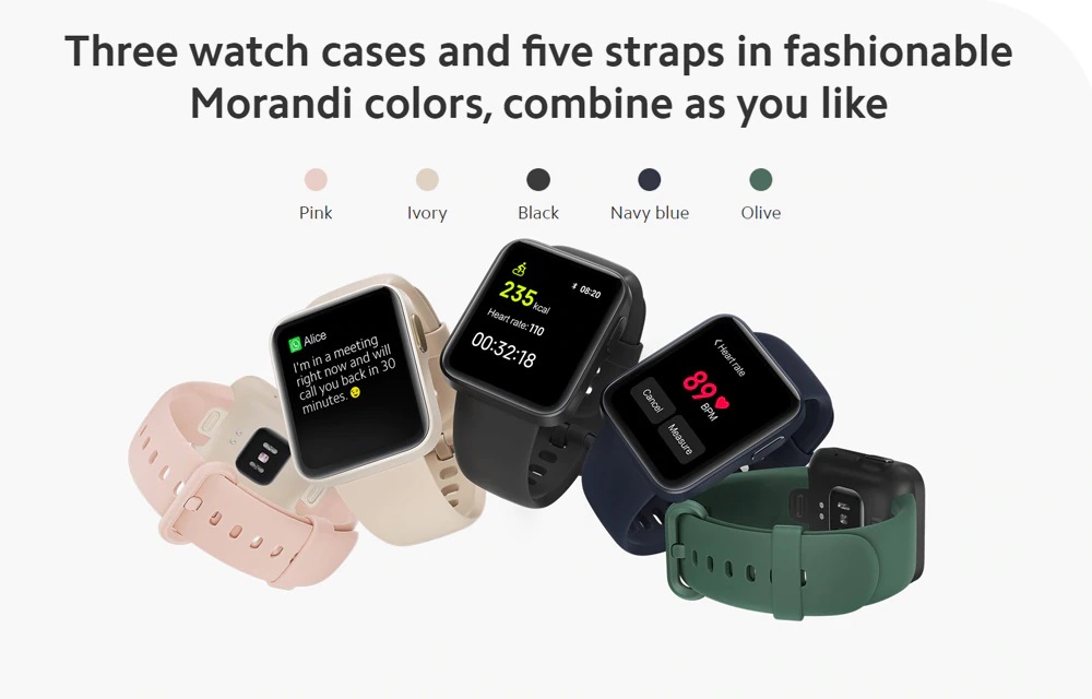 Xiaomi Mi Watch Lite to klasyczny zegarek z kwadratową obudową i silikonowym paskiem. Wyposażono go w 1,
