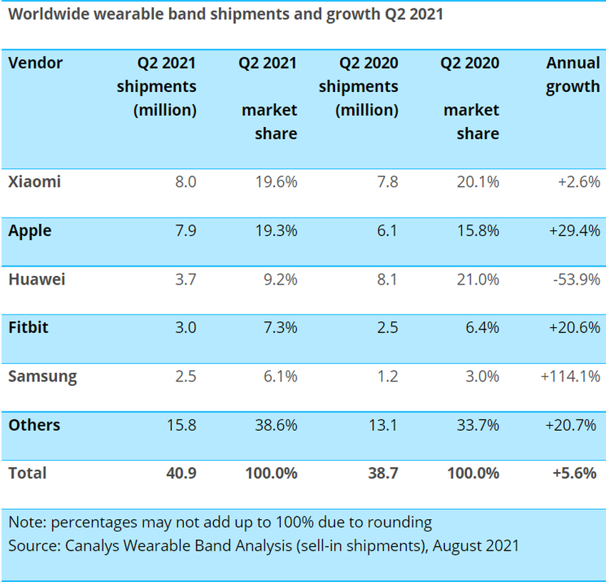 W porównaniu z drugim kwartałem 2020 roku, udział Xiaomi spadł z 20,1% do 19,6%, pomimo wzrostu liczby wysyłek z 7,8 mln do 8,0 mln urządzeń (+2,6%). Mimo to, firmie z Pekinu udało się wspiąć na pierwsze miejsce kosztem spadku Huawei. Producent z Shenzhen spadł na trzecie miejsce z 9,2% udziałem w rynku w porównaniu do 21% w okresie bazowym. Huawei w drugim kwartale tego roku sprzedał 3,7 mln sztuk gadżetów wearable (-53,9%).