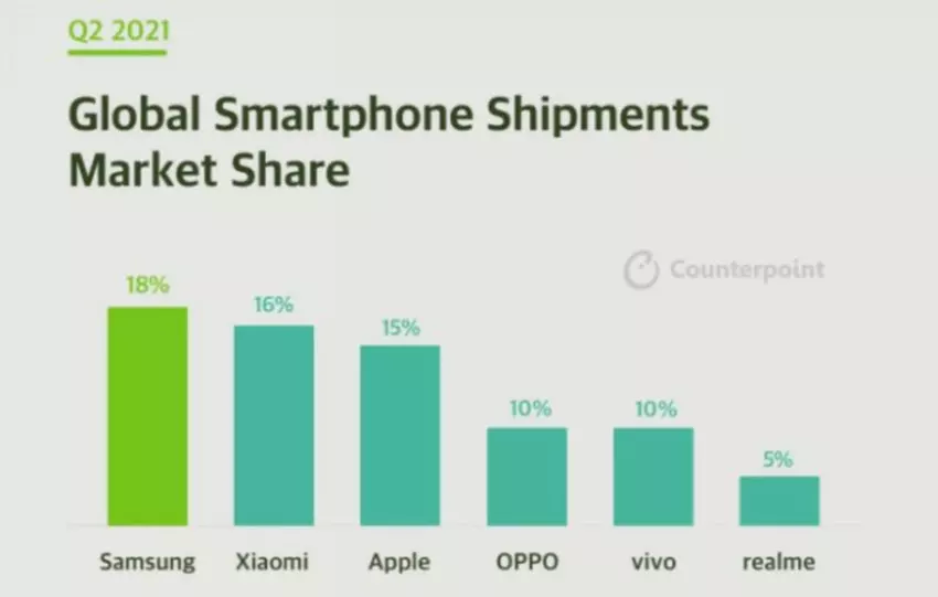 Pierwsze pięć miejsc na globalnym rynku smartfonów zajmują odpowiednio Samsung (18% udziału w rynku), Xiaomi (16%), Apple (15%), Oppo (10%) i Vivo (10%). Na 6 miejscu jest młoda chińska marka Realme (5%), która wyparła Huawei.