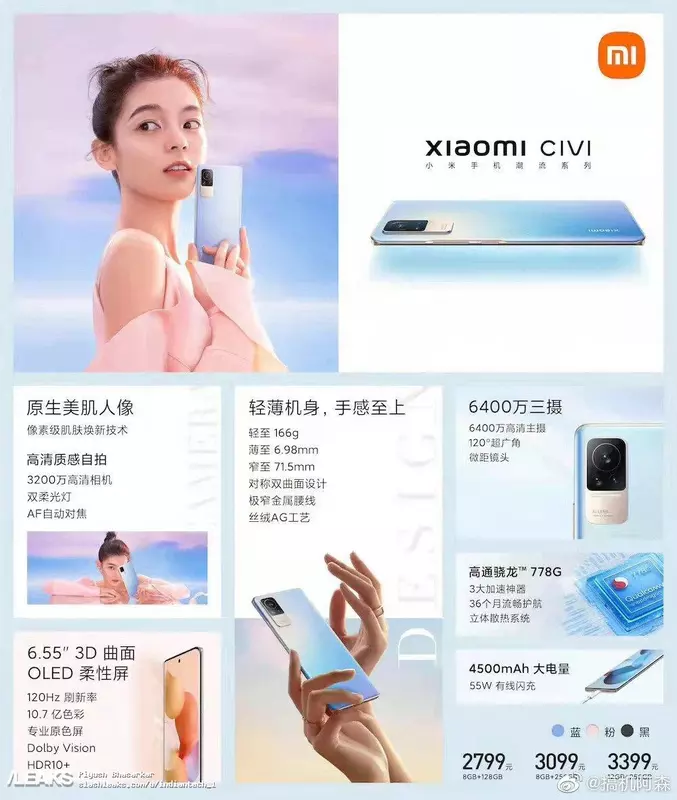 Przypomnijmy, że Xiaomi Civi otrzyma procesor Snapdragon 778G, 6,55-calowy ekran OLED o rozdzielczości FHD+ i częstotliwości odświeżania 120 Hz. Główny aparat będzie miał rozdzielczość 64 MP + 8 MP + 2 MP, natomiast przednia kamera będzie miała rozdzielczość 32 MP. Smartfon będzie również wyposażony w baterię o pojemności 4500 mAh z bezprzewodowym ładowaniem 55W, system Android 11, NFC, głośniki stereo oraz firmware MIUI 12.5