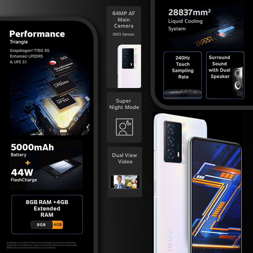 Pod maską iQOO Z5 pracuje procesor Snapdragon 778G. Układowi towarzyszy 8/12 GB pamięci RAM oraz system chłodzenia cieczą. Przy okazji, pamięć RAM w tej nowości jest rozszerzalna poprzez Extended RAM 2.0. Urządzenie otrzyma również 64MP + 8MP + 2MP potrójny aparat główny, 5000mAh baterię, 44W wsparcie szybkiego ładowania, system operacyjny Android 11 z markową powłoką, skaner boczny, głośniki stereo i jack 3,5mm.