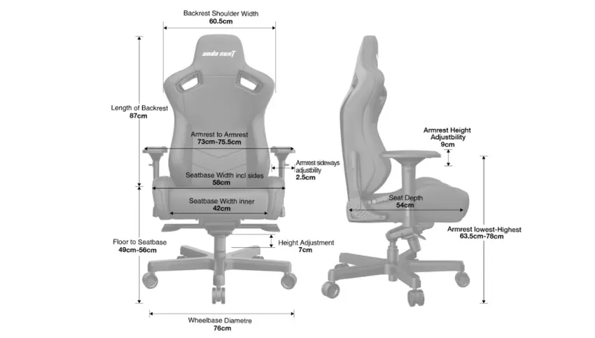 | Anda Seat T-Pro 2 Szerokość oparcia przy ramionach wynosi 60,5 cm, odległość między podłokietnikami wynosi 73-75,5 cm, szerokość dna siedziska od wewnątrz wynosi 42 cm, szerokość dna siedziska z bokami wynosi 58 cm, regulacja podłokietnika bocznego - 2,5 cm, średnica rozstawu osi - 76 cm, długość oparcia - 87 cm, regulacja wysokości podłokietnika - 9 cm, wysokość od podłogi do podłokietnika - 63,5-78 cm, głębokość siedziska - 54 cm, wysokość od podłogi do podstawy siedziska - 49-56 cm. Firma twierdzi, że krzesło jest odpowiednie dla wysokich osób o wzroście do 2m 10cm i wytrzymuje 200kg. |