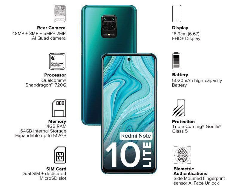 Redmi Note 10 Lite posiada jednordzeniowy układ 8nm Snapdragon 720G z 4-6GB pamięci RAM. Pamięć masowa pomieści do 128GB danych. Smartfon posiada wbudowaną baterię o pojemności 5,020mAh oraz możliwość szybkiego ładowania 18W.