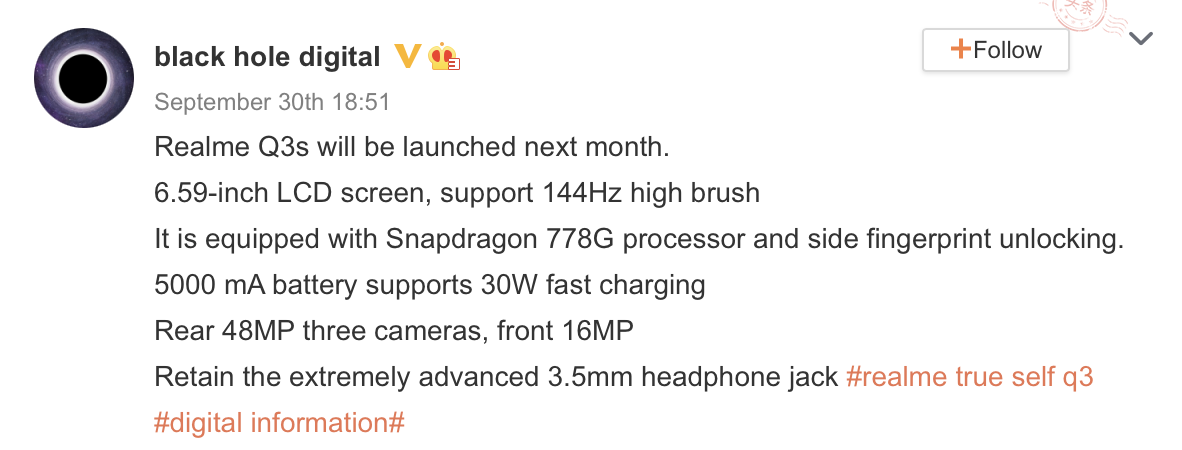 Według insidera w sieci społecznościowej Weibo, urządzenie będzie się nazywać Realme Q3s. To znaczy, że będzie to następca oryginalnego Realme Q3, który zadebiutował w kwietniu.